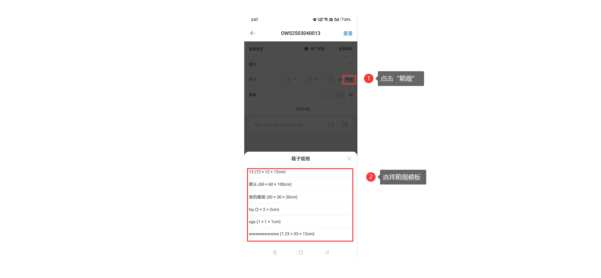 2.1 点击“开始装箱”后,进入此页,填写好箱规等基本信息,尺寸支持根据PC端中添加的规格模板选择。PC端箱规的设置路径:【仓库】-【扫描装箱】中添加