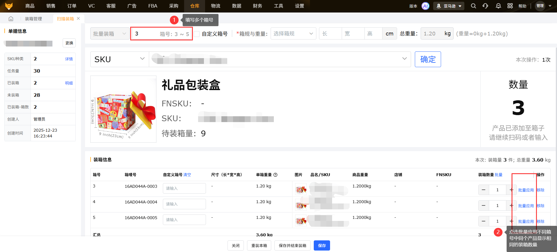 (2)选中【批量装箱】时,此时箱号一栏允许编辑修改箱号,且必填,否则报错提示“请设置批量箱号”;并且支持以SKU维度批量应用装箱数量。