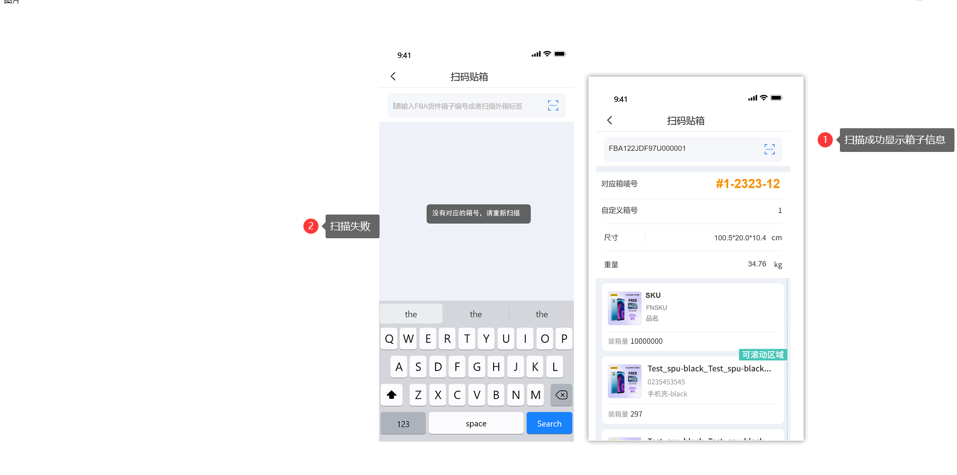 扫描成功语音提醒“成功”,对应显示箱子信息。扫描失败则显示“没有对应箱号,请重新扫描”,同时语音提示“失败”。
