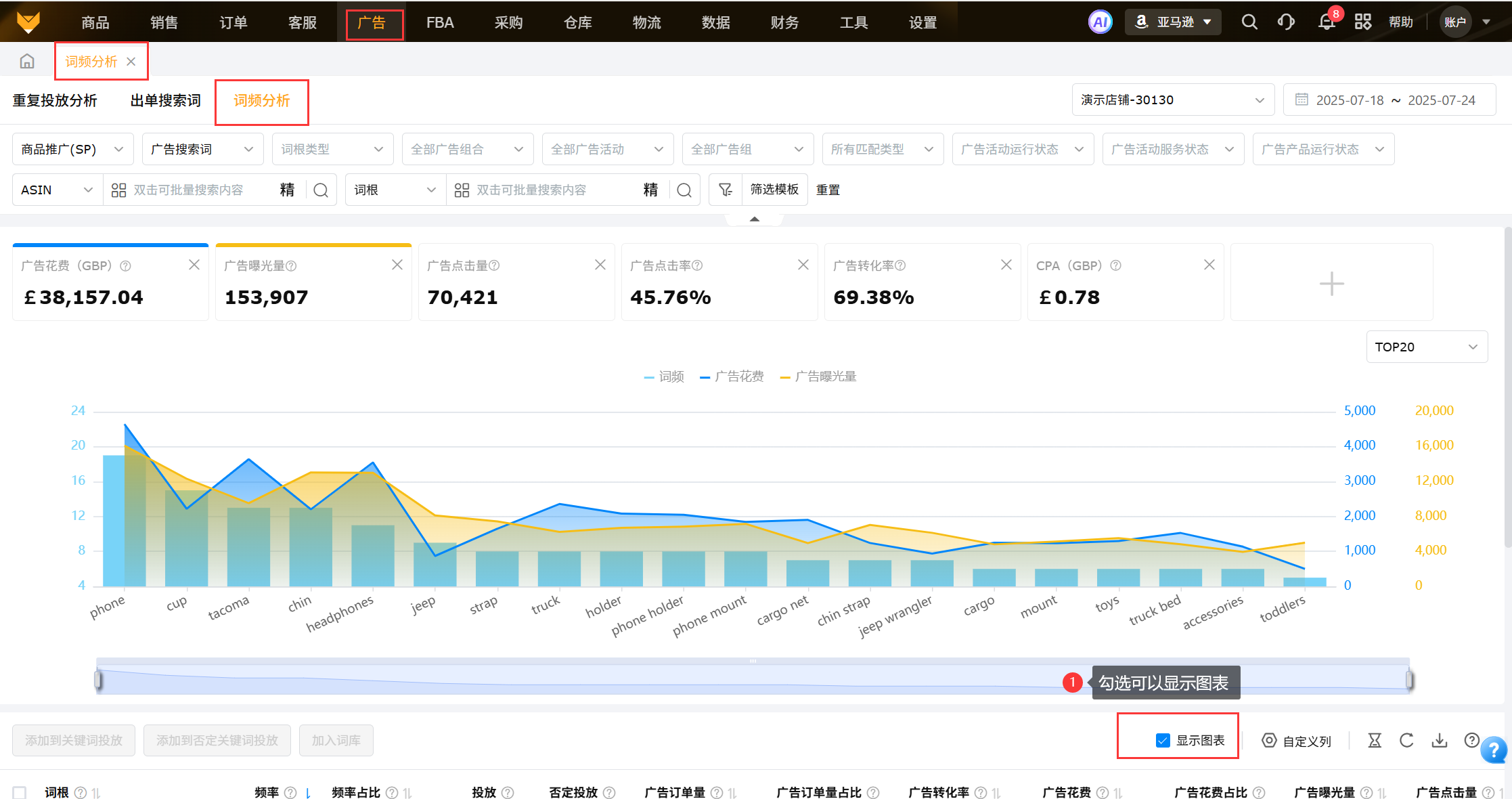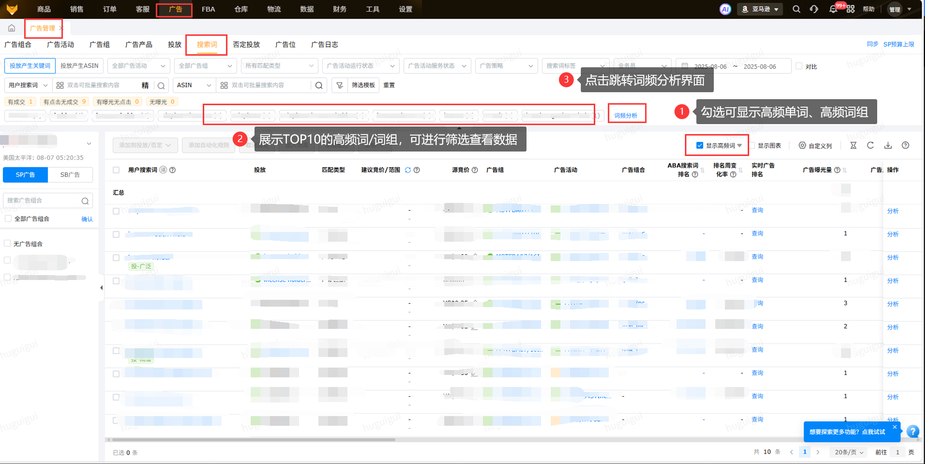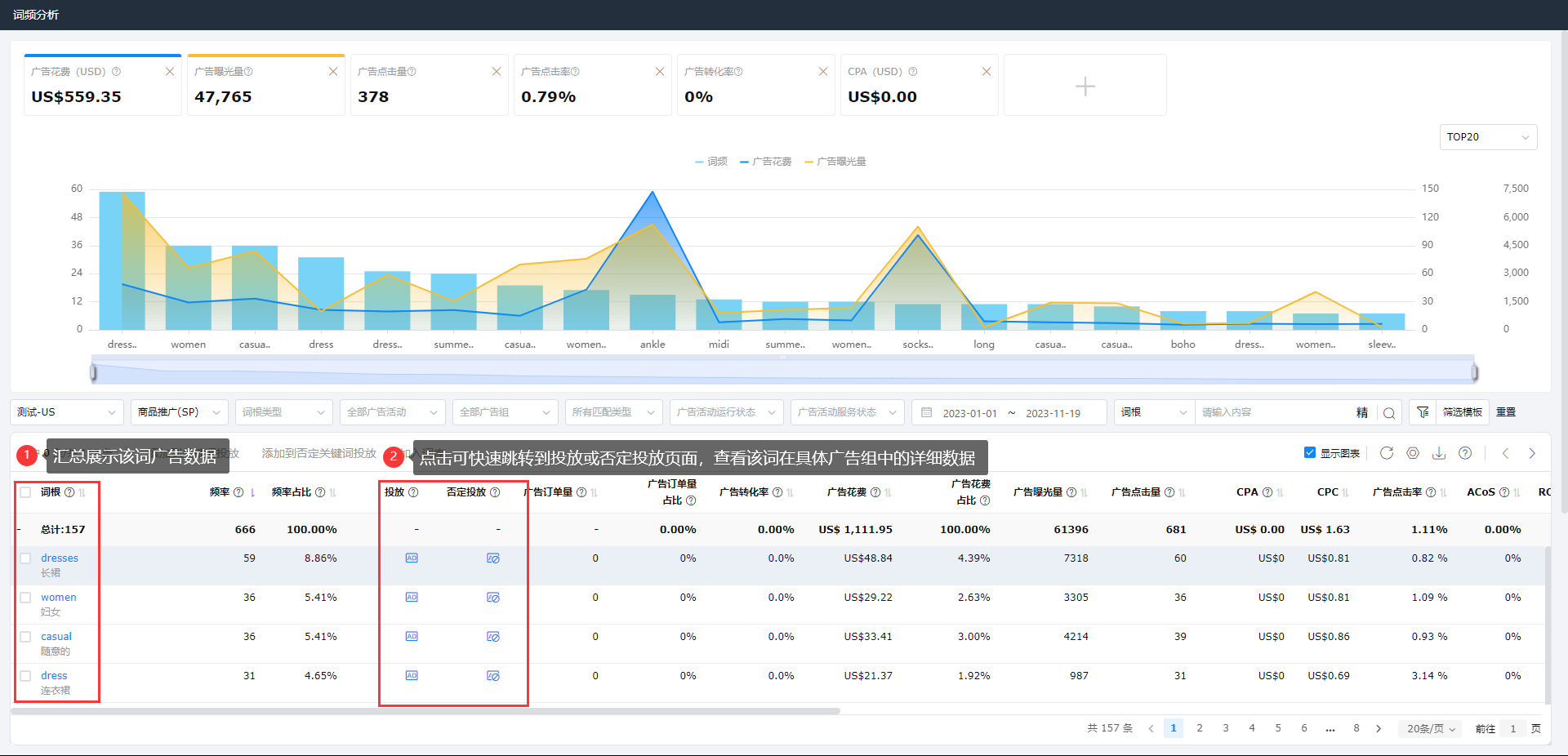 广告管理页面-搜索词维度,勾选显示TOP10的高频单词/词组,统计对应词出现频率,单个点击展示对应词根数据