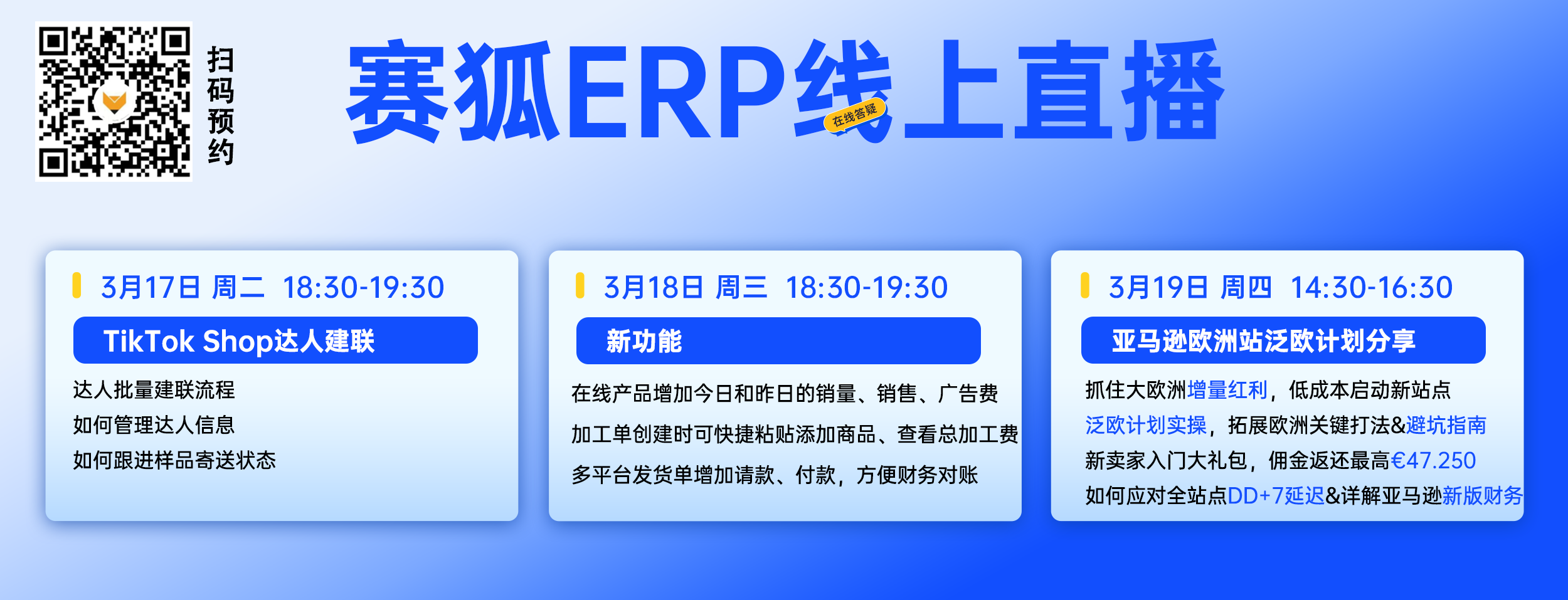 本栏目为赛狐线上培训-直播课,专为刚上手赛狐ERP的用户打造,旨在帮助您快速了解,使用系统,更快帮助您精细化运营。