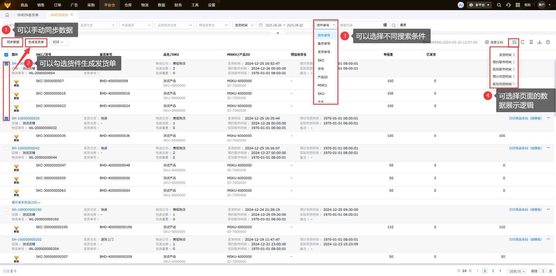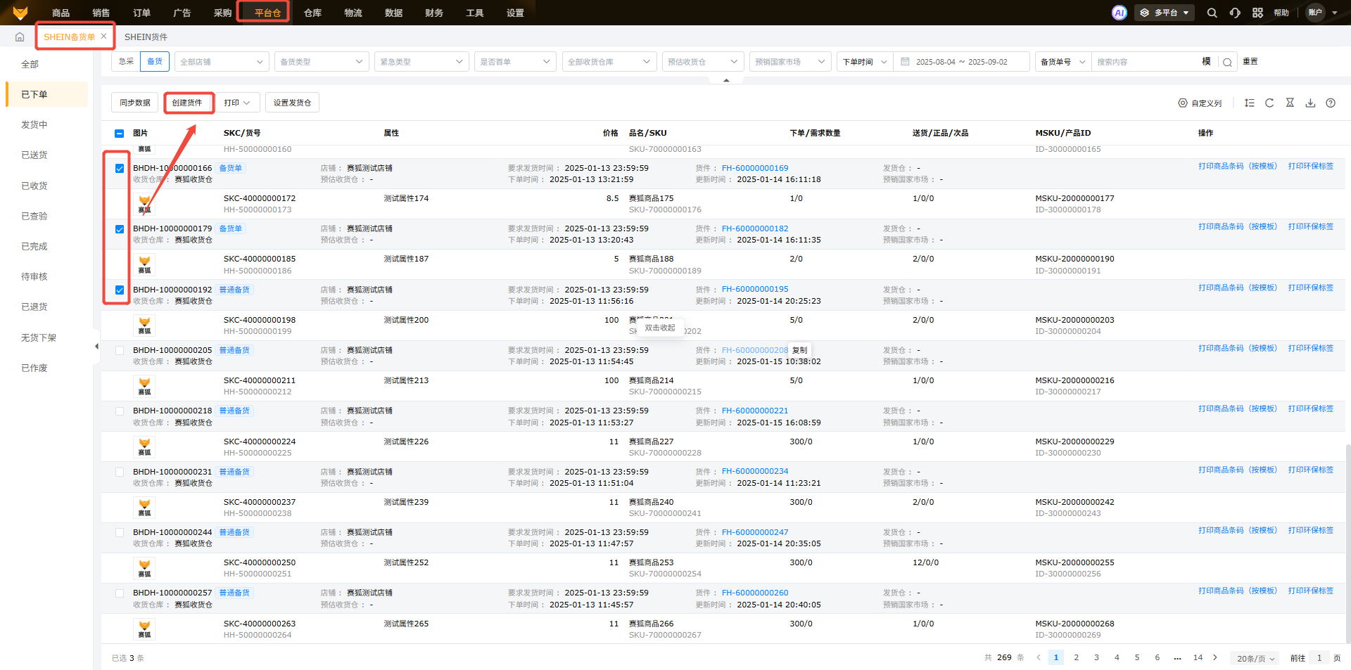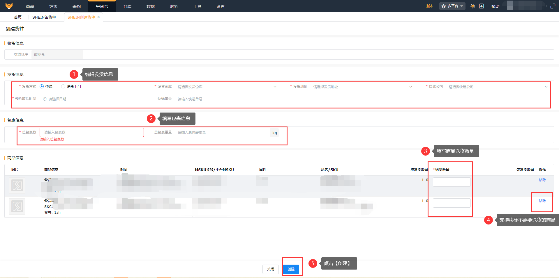 入口:在【平台仓】-【SHEIN备货单】页面①在备货单页面勾选备货单,点击【创建货件】;
