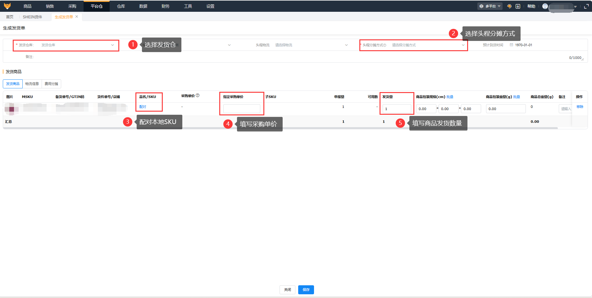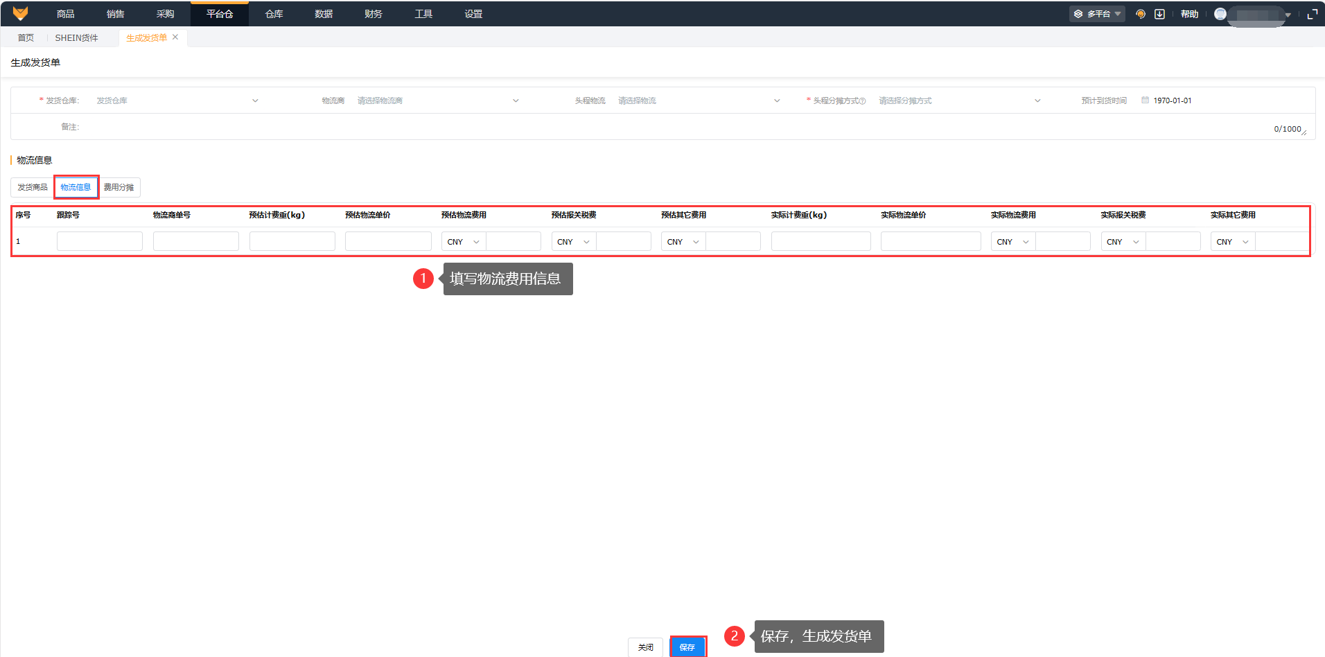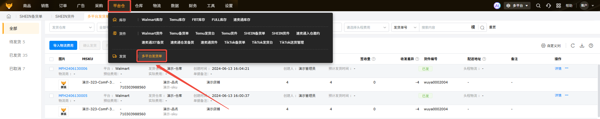 支持勾选货件生成发货单,选择发货仓库、填写发货量、采购单价、头程费用等,点击确认即可生成,生成后可以在【平台仓】-【多平台发货单】页面进行查看。