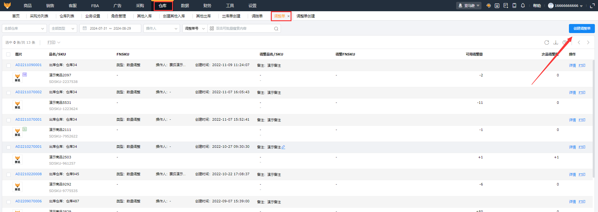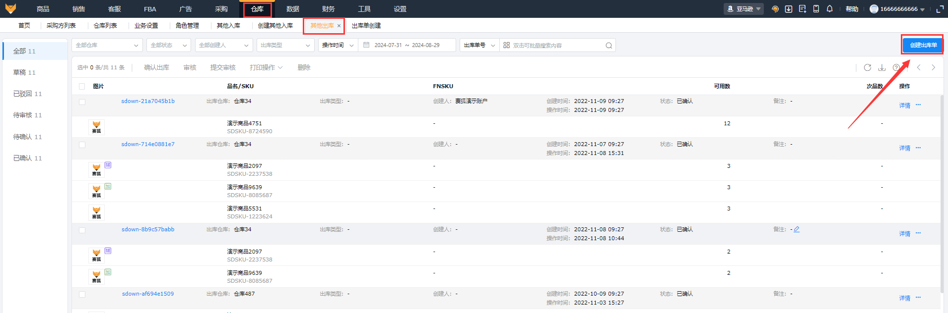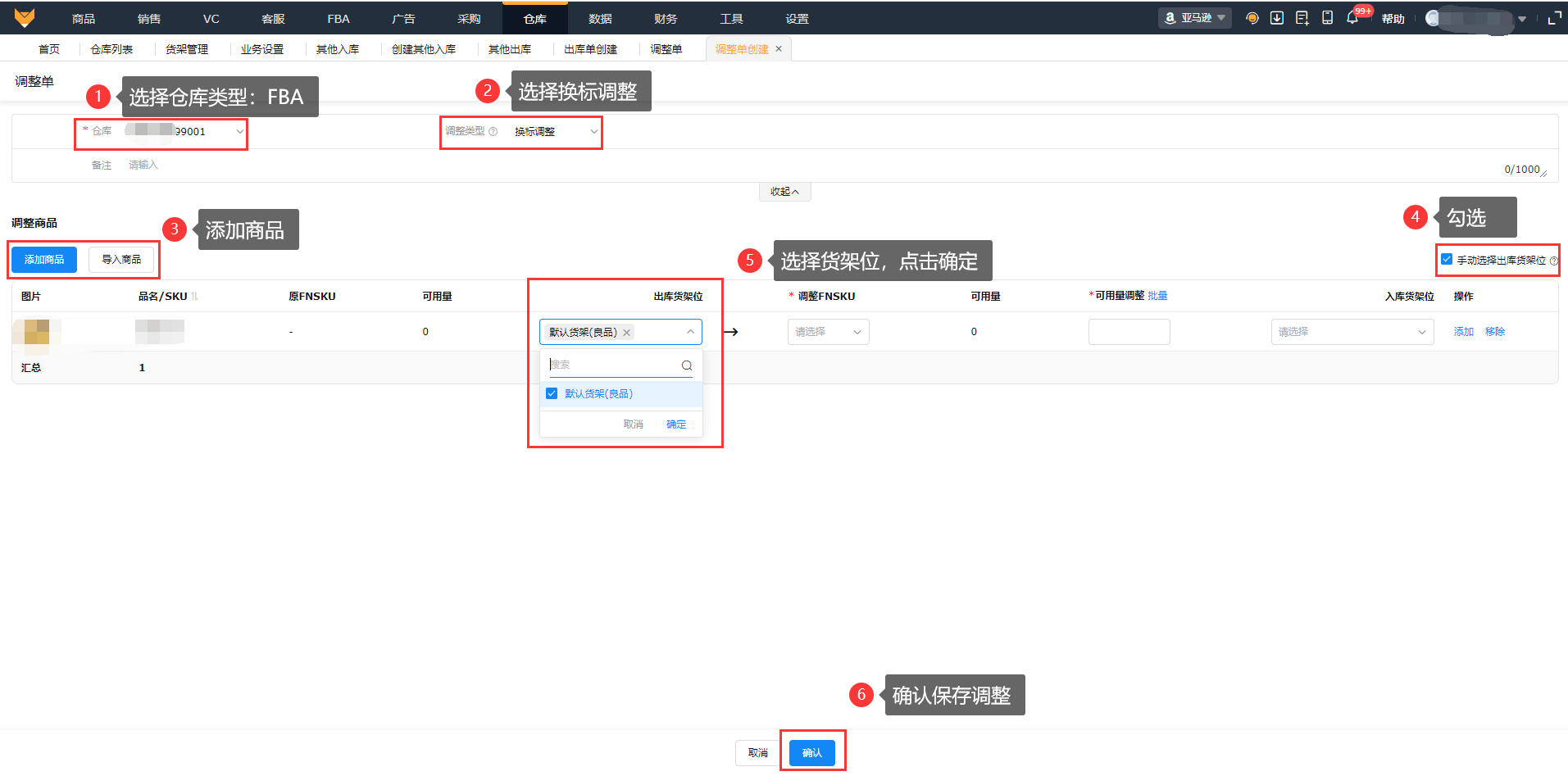 (2)出库单和调整单在【仓库列表】创建的仓库类型为FBA(中转仓)时勾选了1批次1货架位后可以手动选择货架位。