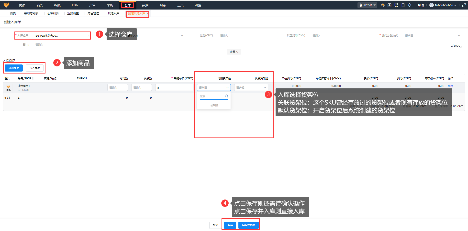 (1)入库单:如果货架位没有库存,支持用【其他入库】创建入库单入库