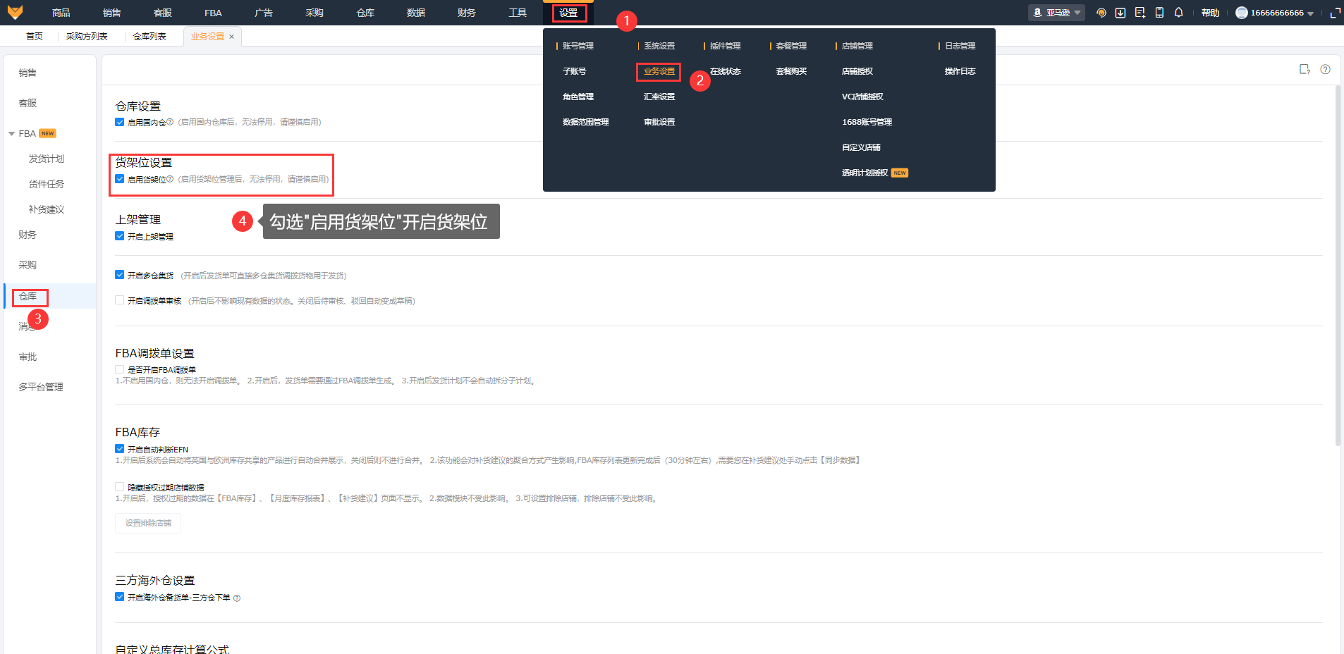Q1:登录的是主账号,为什么在在导航栏列表没有货架管理这个菜单栏?A1:需要在【设置】-【业务设置】-【仓库】启用国内仓以及货架管理功能。