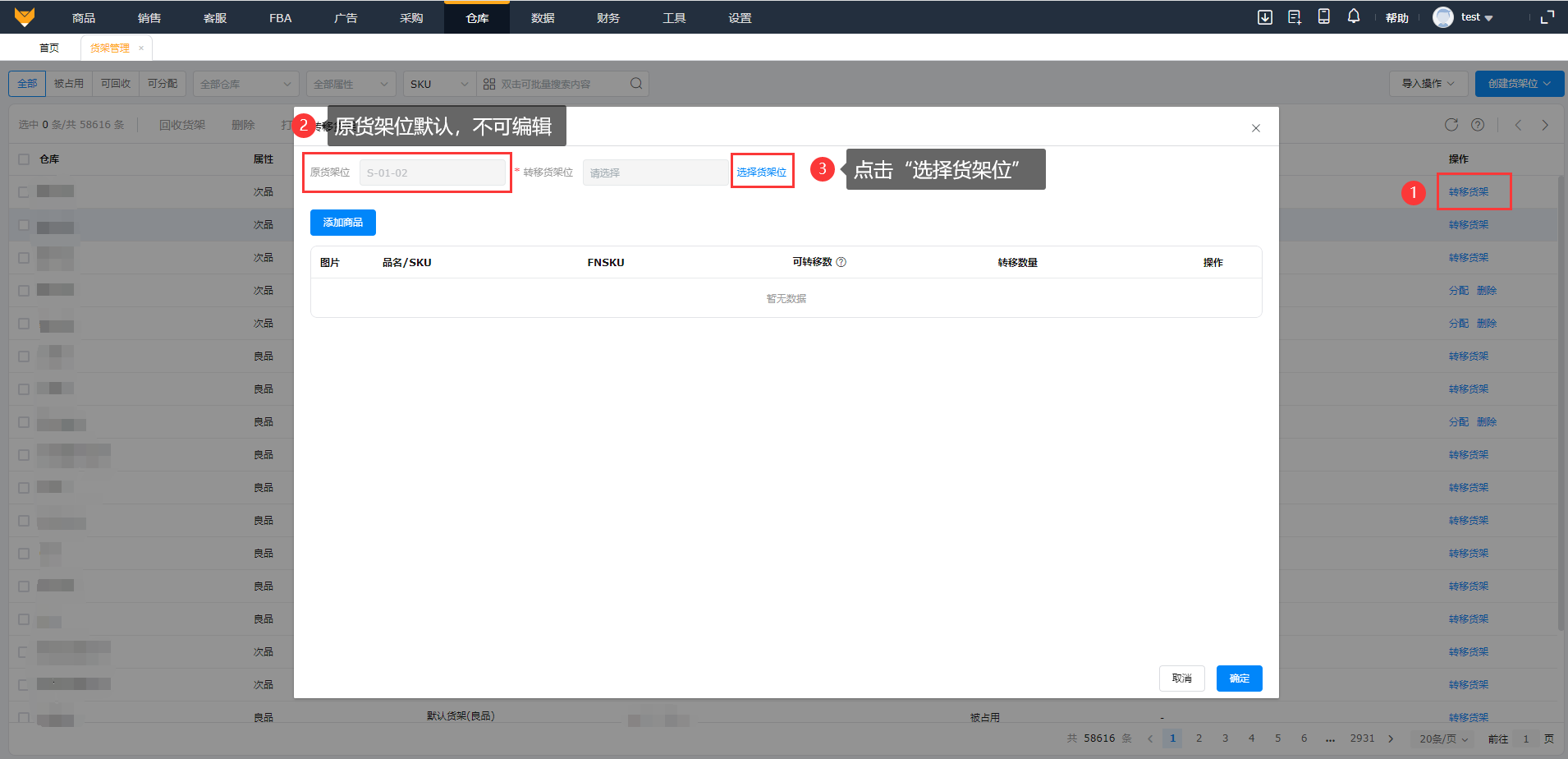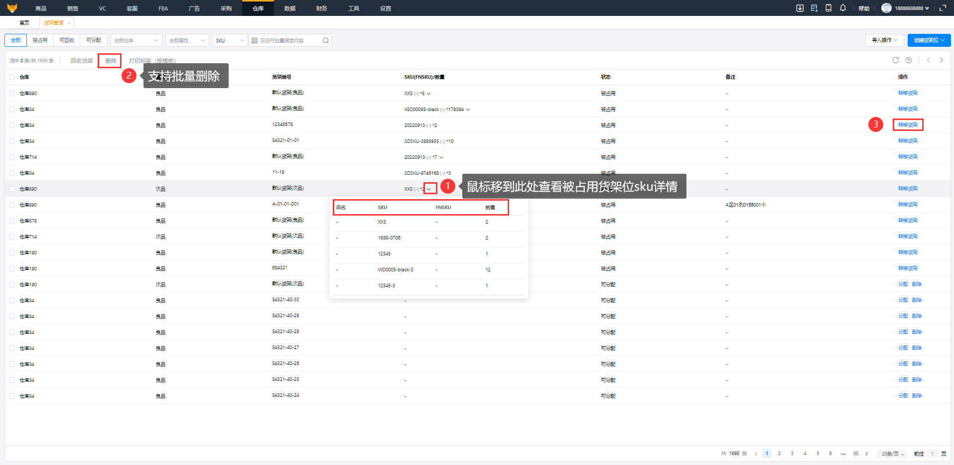 (2)【被占用】支持转移货架,可展开查看SKU、FNSKU和数量