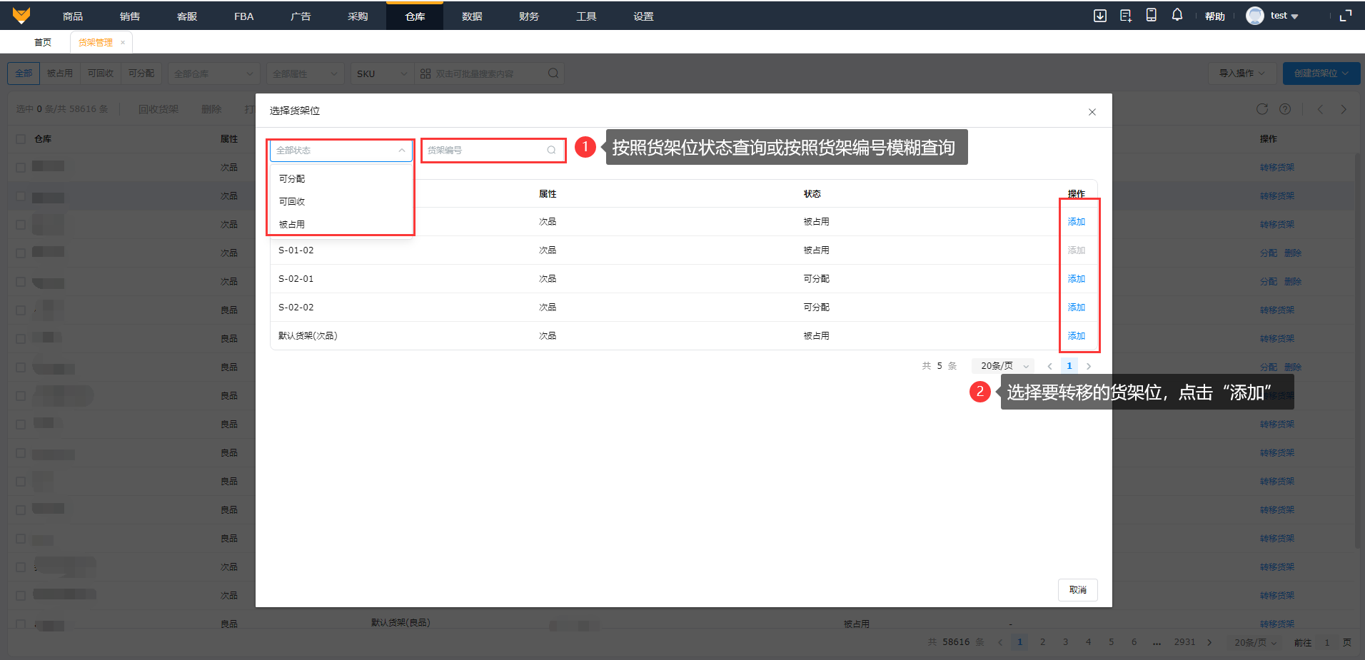 (3)点击“转移货架”,选择要转移的货架位,支持筛选货架状态以及按照货架编号模糊查询,选择可转移的货架位添加;
