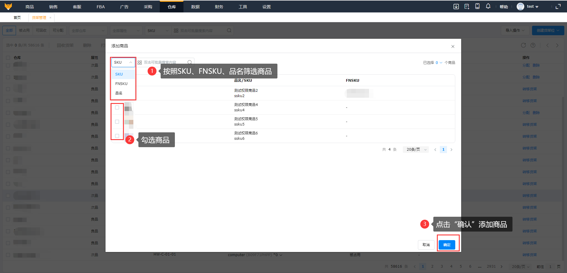 添加要转移的商品,支持按照SKU、FNSKU、品名筛选商品,勾选选择商品确认添加,填写转移数量(必填),点击确认则进行校验,校验通过则提示转移成功。