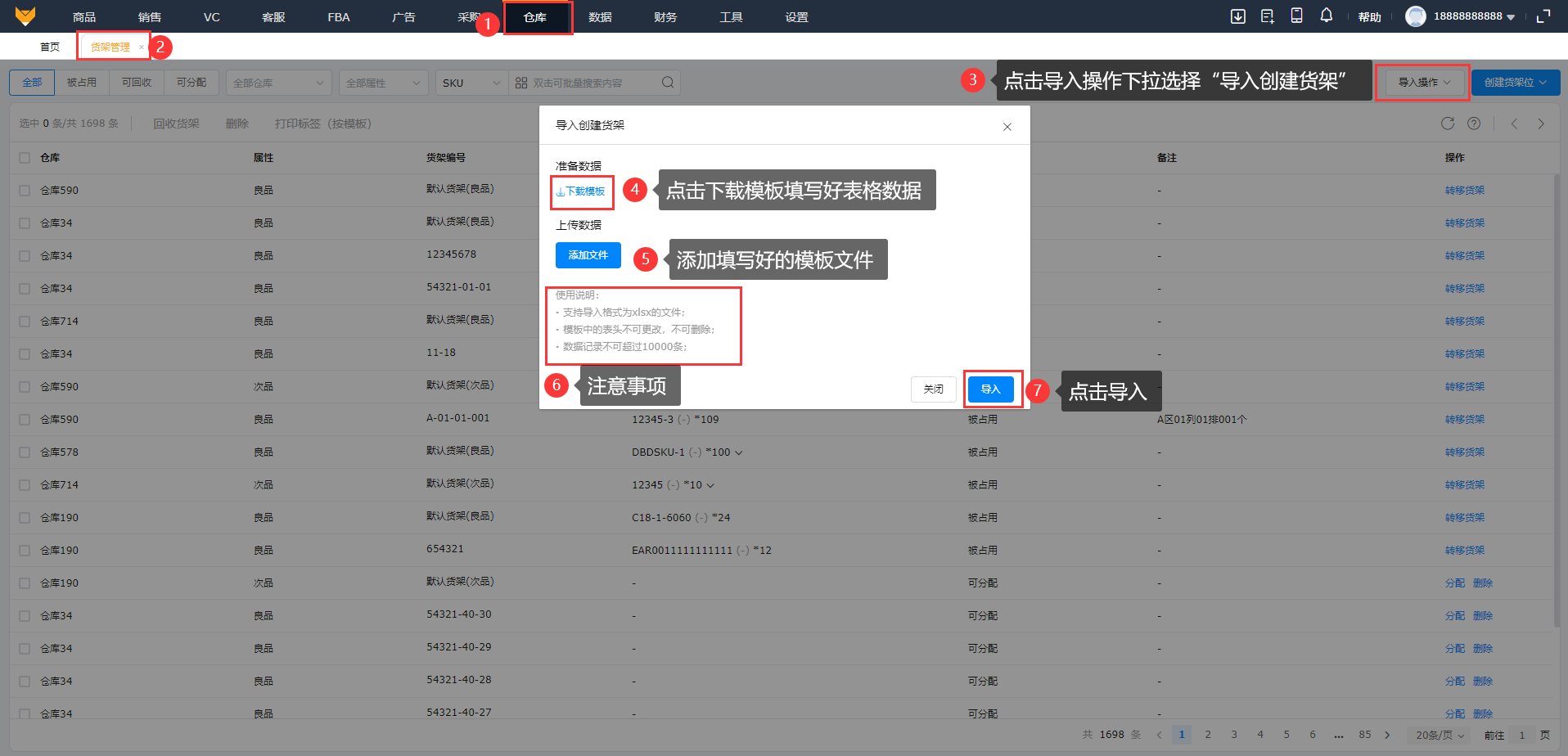支持批量创建货架位、导入货架位和初始化货架位,点击导入操作下拉选择对应的下载模板,填写好数据再点击“添加文件”导入即可
