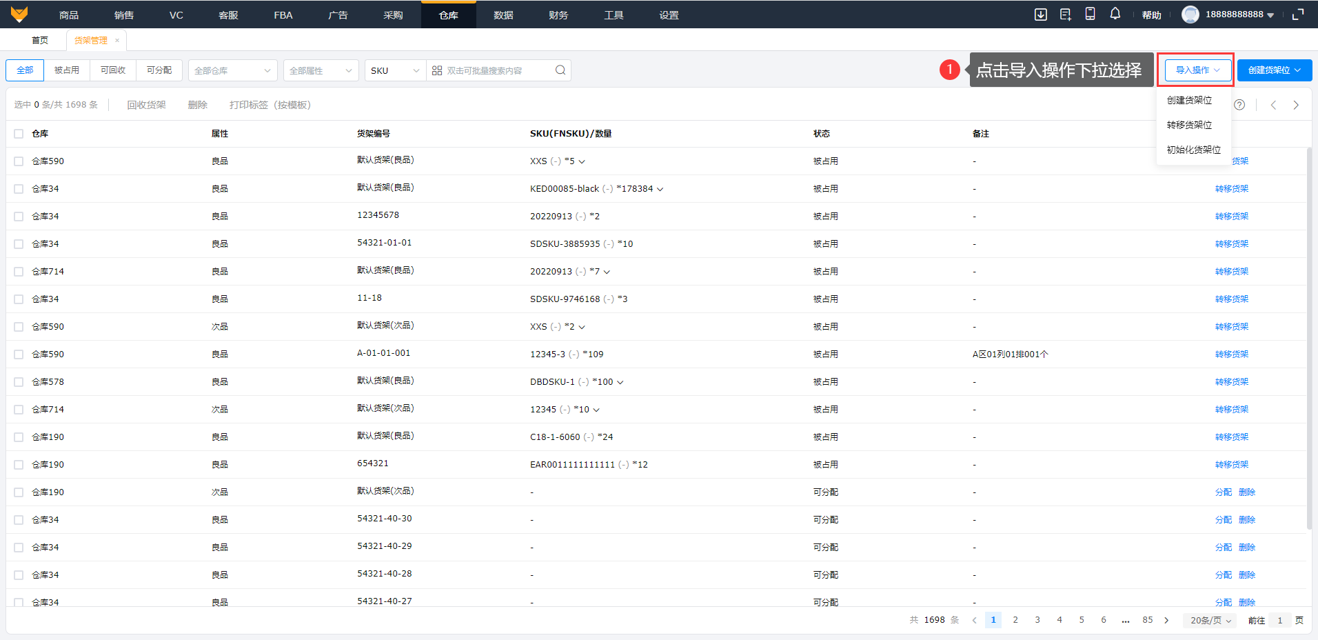 注:初始化货架位:现有库存开启货架功能后,会有一个初始货架位,方便自定义录入SKU