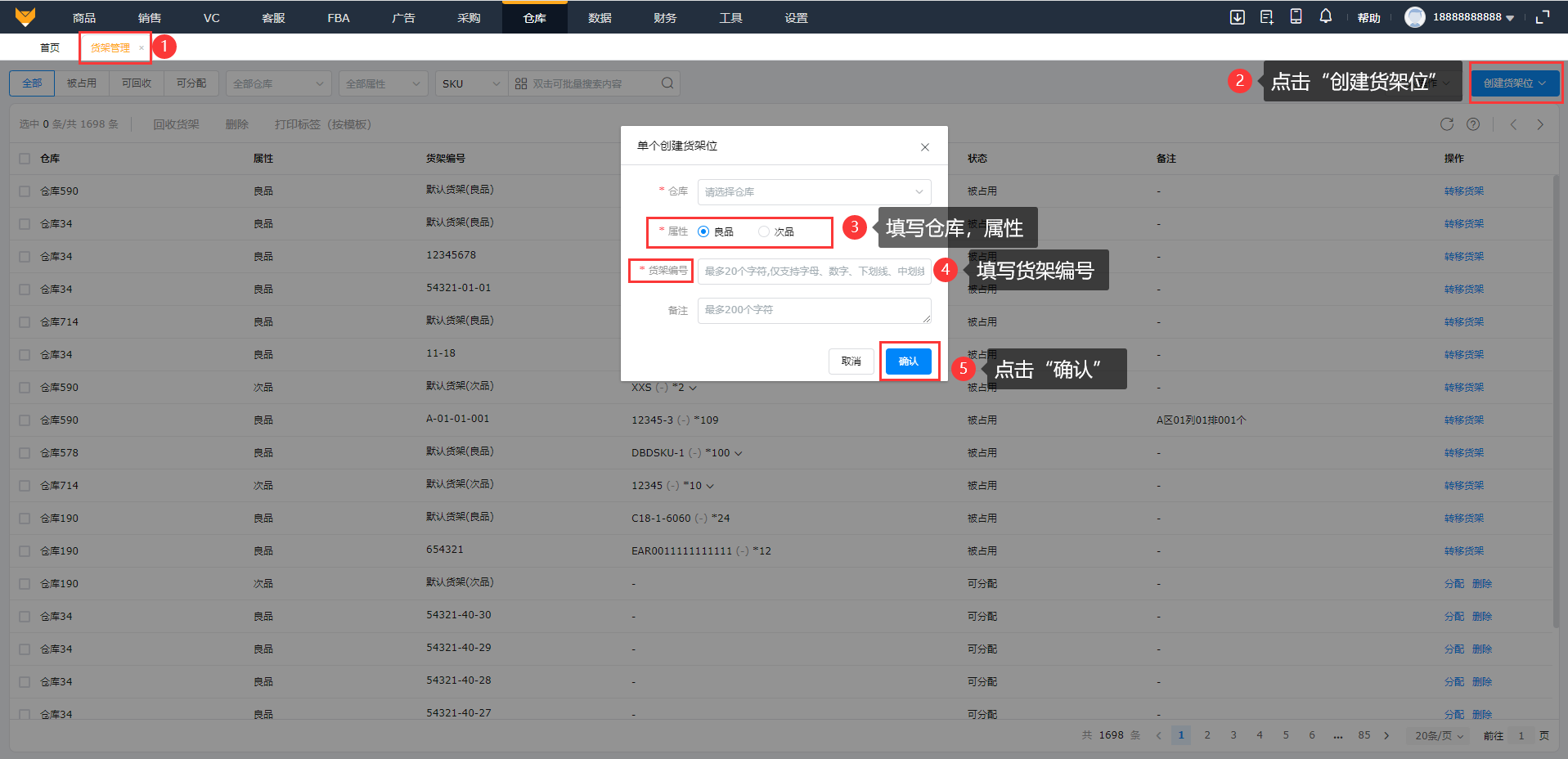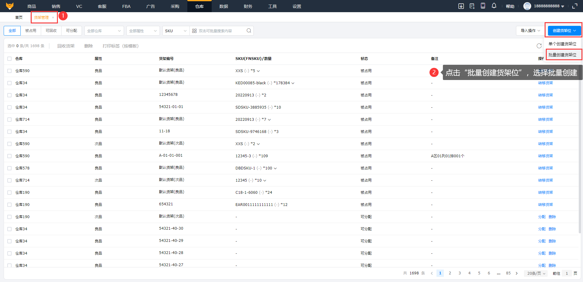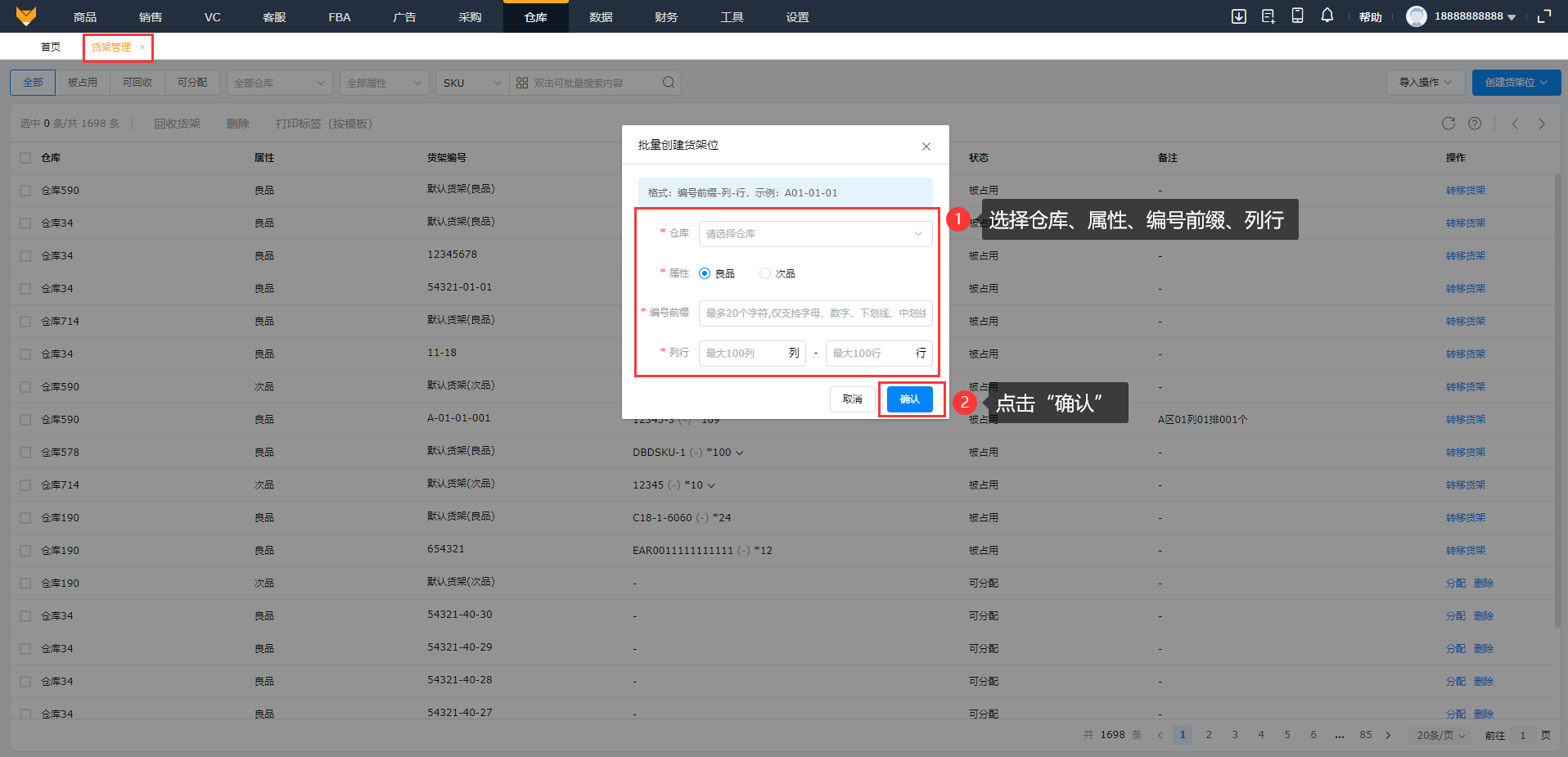 点击“创建货架位”选择“批量创建货架位”,填写好信息,点击【确认】批量创建货架位成功