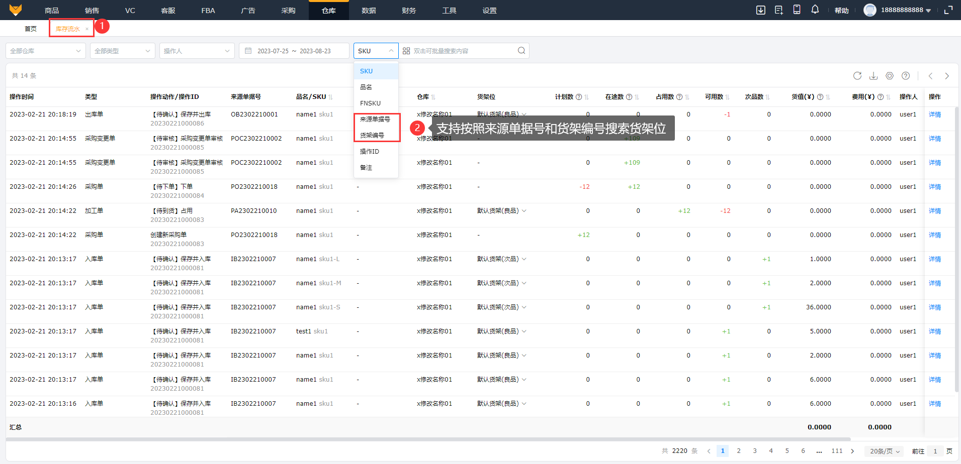 【仓库】-【库存明细】可查看货架位库存,【库存流水】支持按货架编号搜索查看。