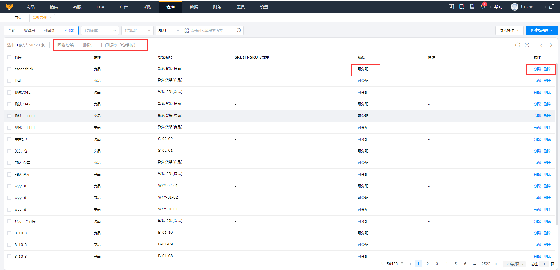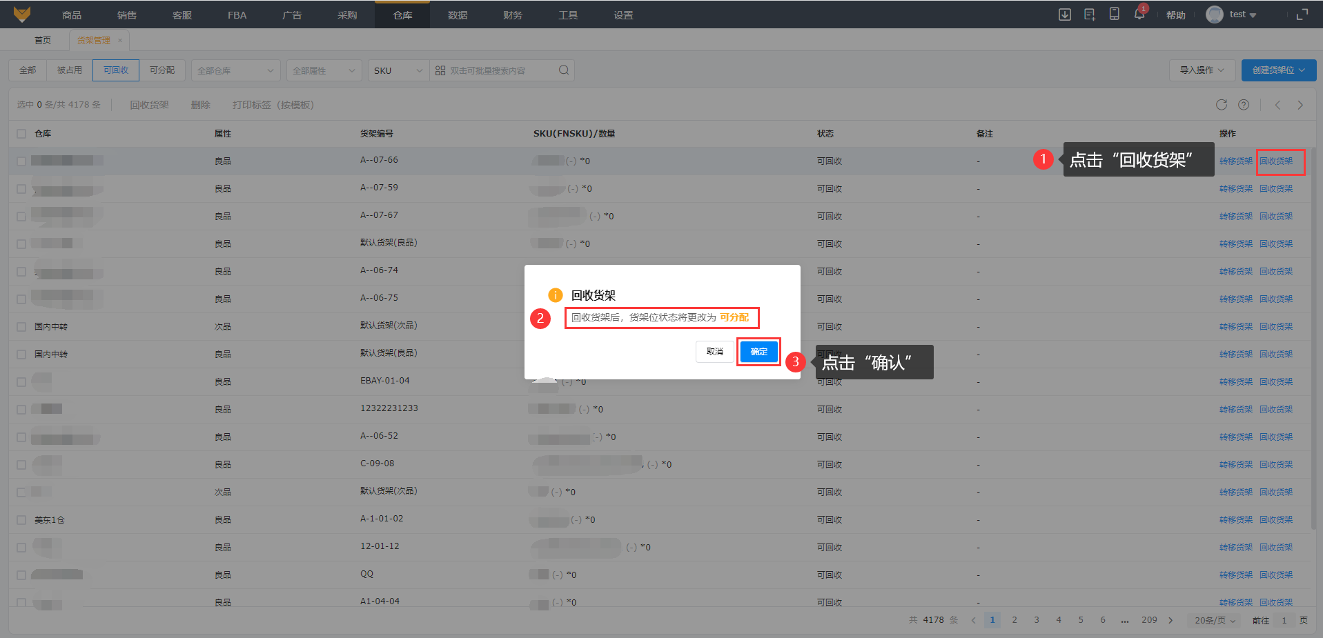 (4)可回收支持转移货架和批量删除货架位,点击“回收货架”后变成【可分配】状态。