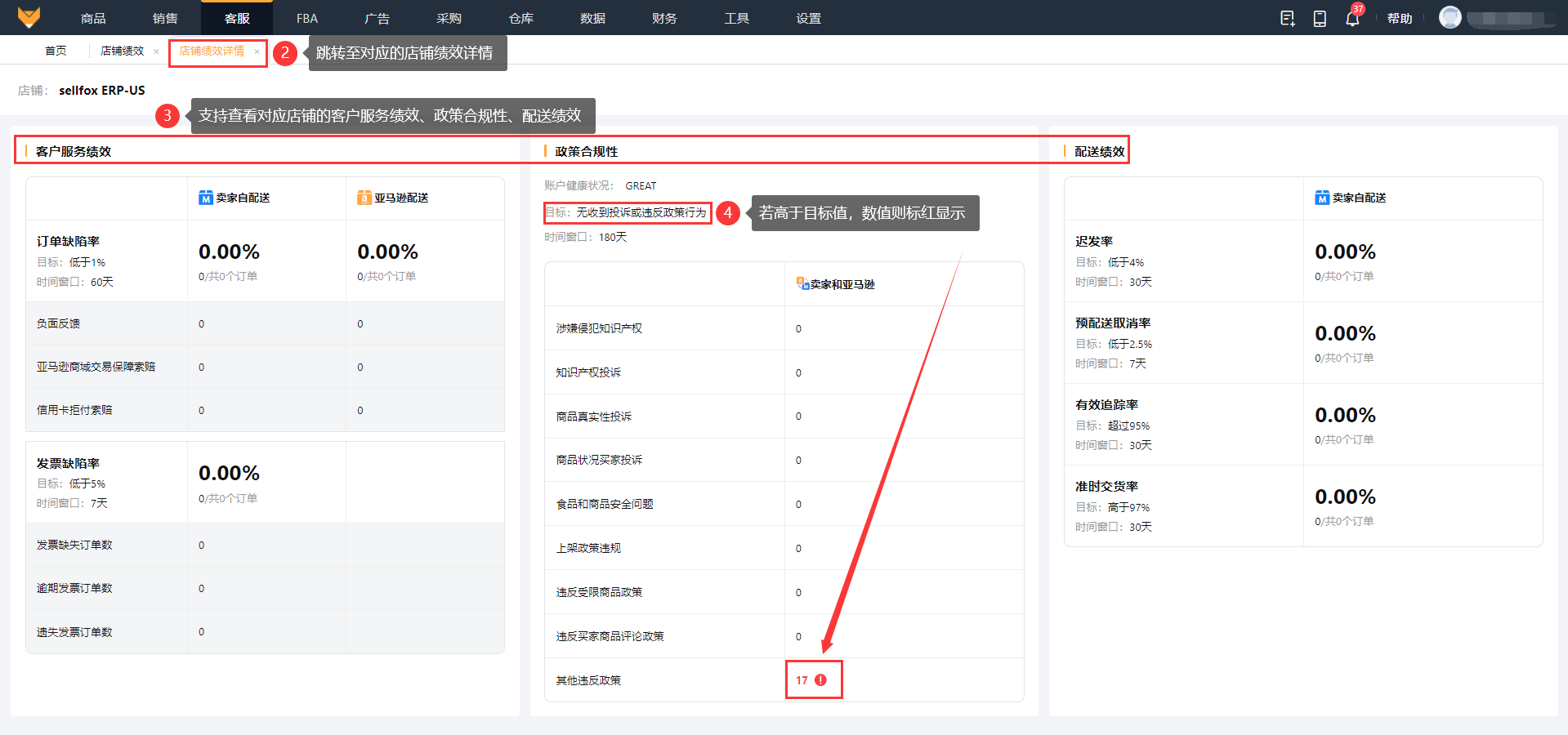 点击“查看”,跳转至店铺绩效详情页面;支持查看对应店铺的客户服务绩效、政策合规性、配送绩效数据;当数值高于目标值时,字段标红展示。