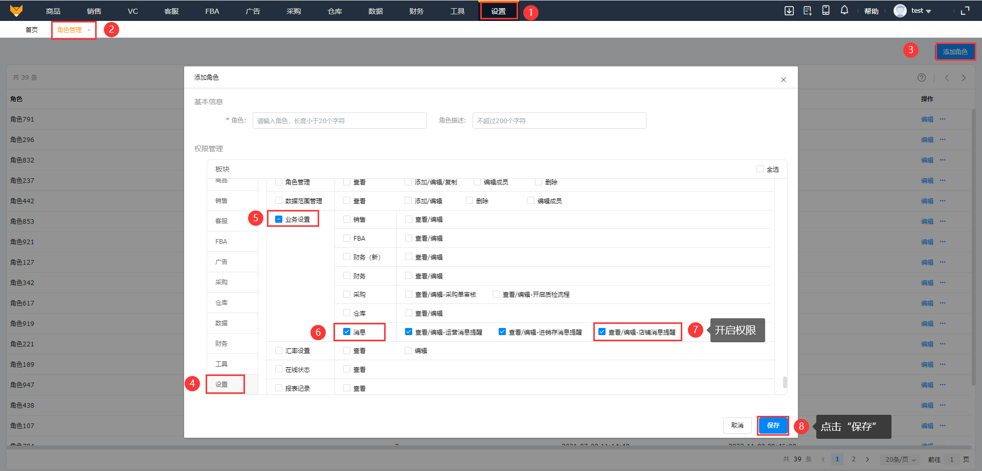 若是子账号,需主账号在【设置】>【角色管理】里,开启消息的“查看/编辑-店铺绩效异常预警”的权限;