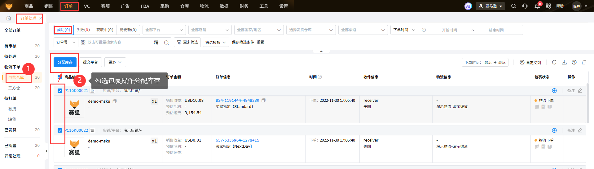 在【待处理】里针对Y2订单分配仓库(国内仓),分配渠道,然后操作物流下单,包裹进入【物流下单】-【自营仓库】状态栏下;