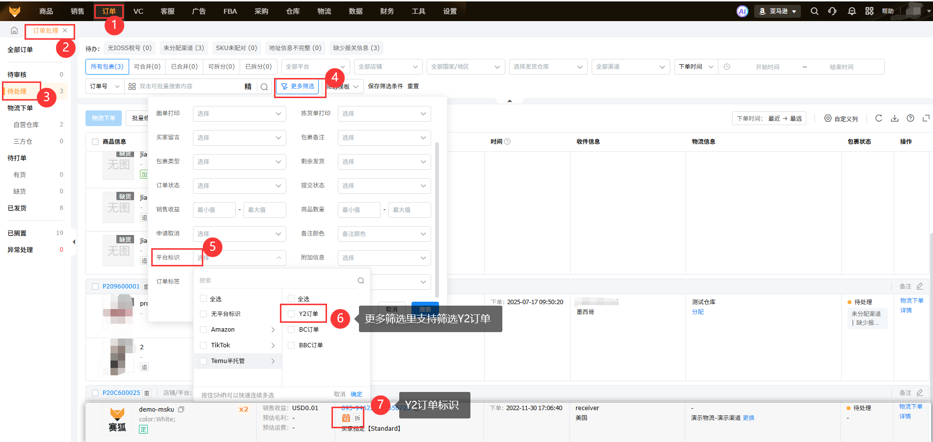 ⑥Y2订单会有“传”标识是从国内仓发货模式的,从海外仓发货模式没有该标识;