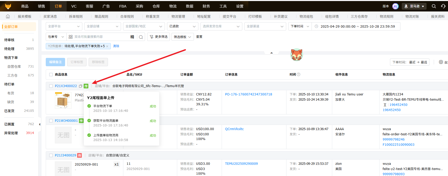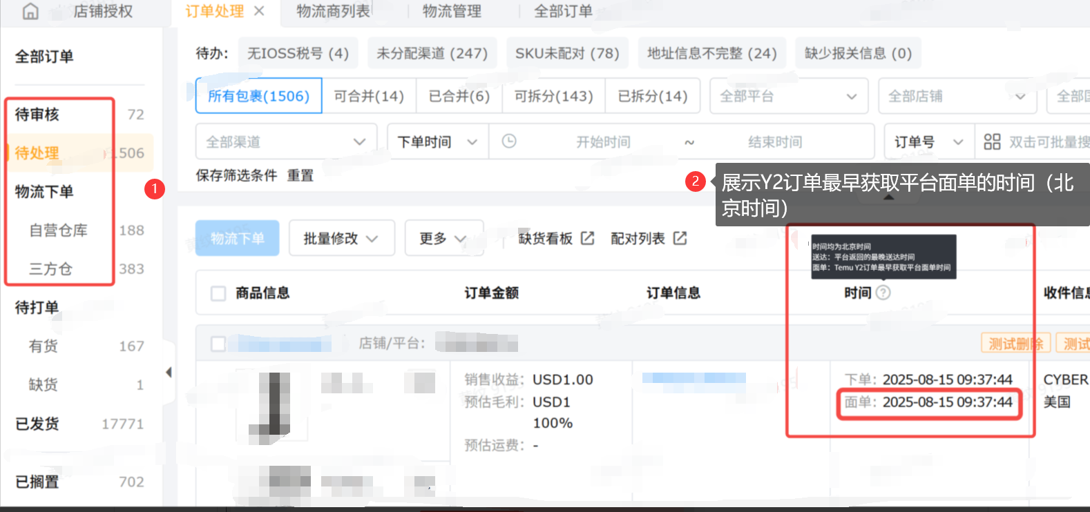 订单处理页面,Y2订单自动带上橙色“Y2”标识,且页面支持筛选Temu Y2订单,展示最早获取平台面单的时间。