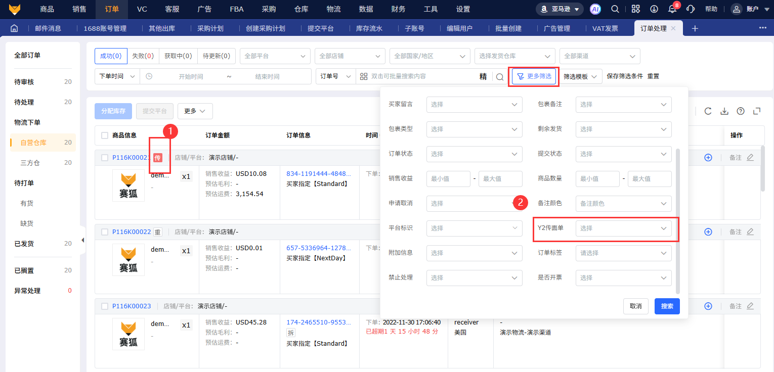 注意:在待打单或已发货,Y2订单的包裹会被打上“传”的标识。