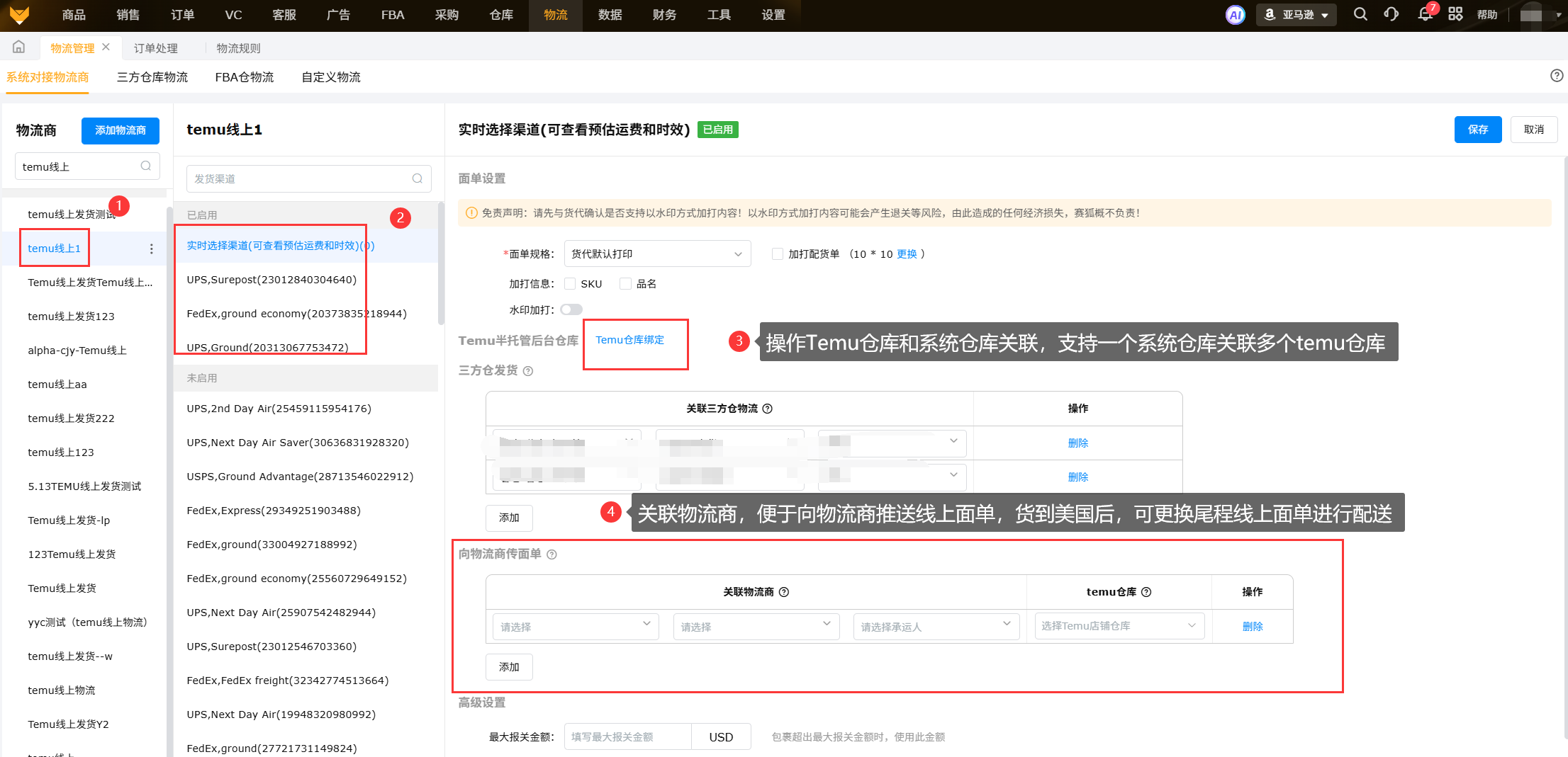 启用线上发货渠道时,要进行设置“向物流商传面单”,关联物流商,设置后,会先向线上物流下单并获取面单,然后将面单传给关联的物流商。