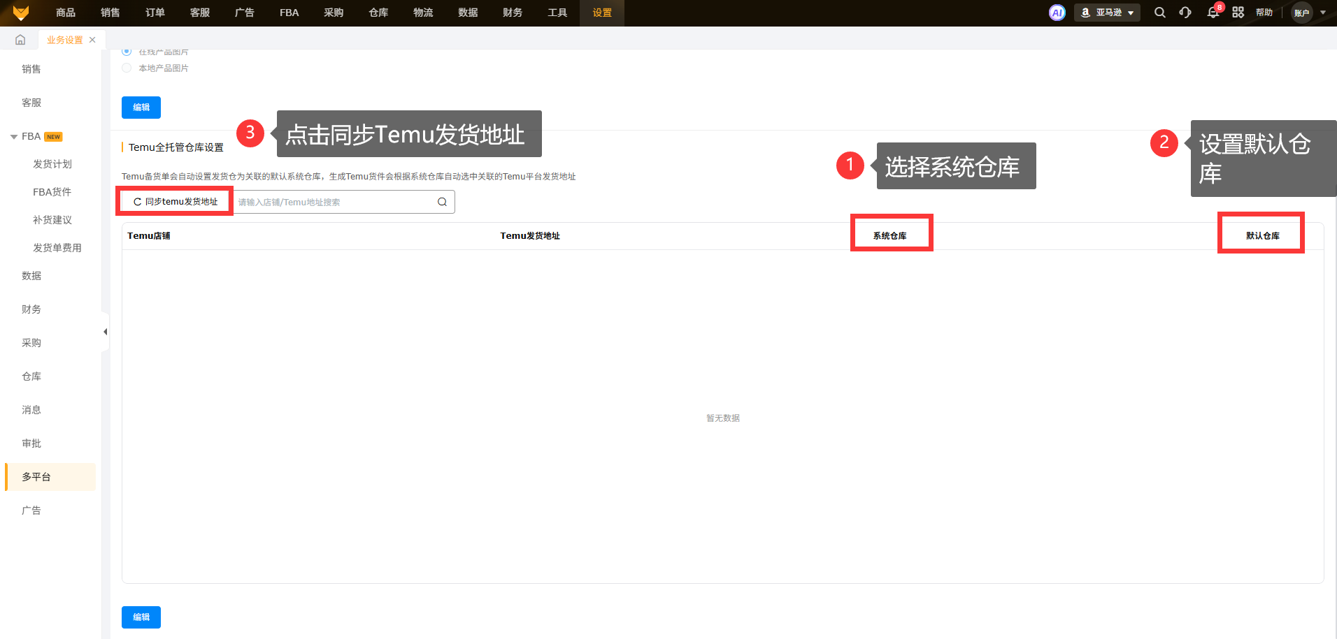 绑定系统仓库路径:亚马逊--设置--业务设置--多平台。选择系统仓库进行设置,设置了系统仓库可以开启设置默认仓库,支持点击同步Temu发货地址。