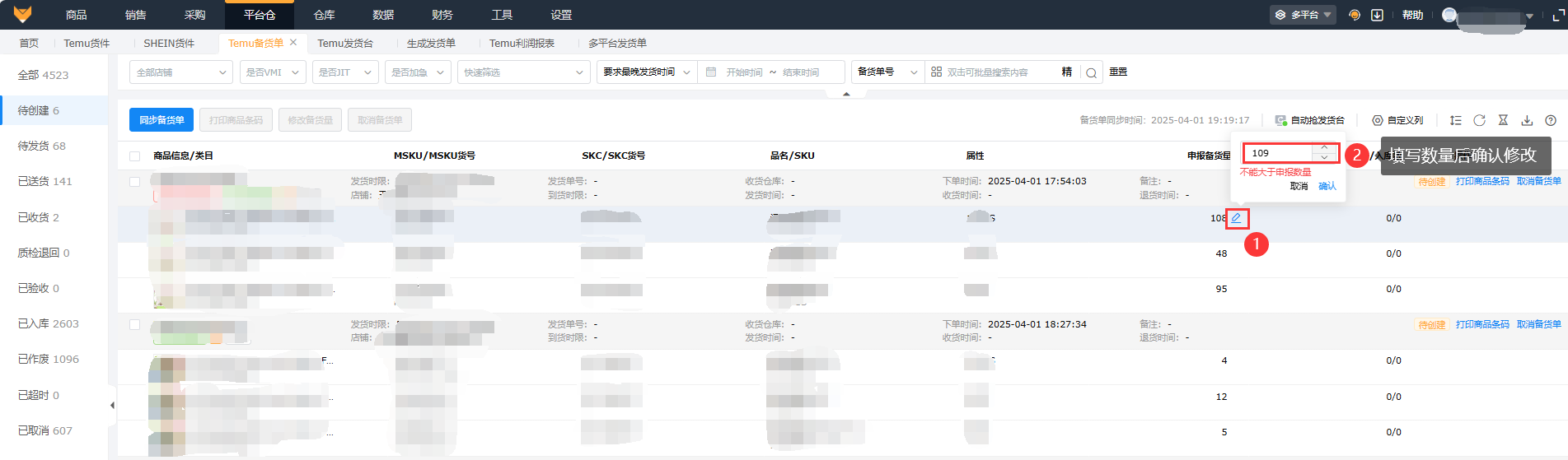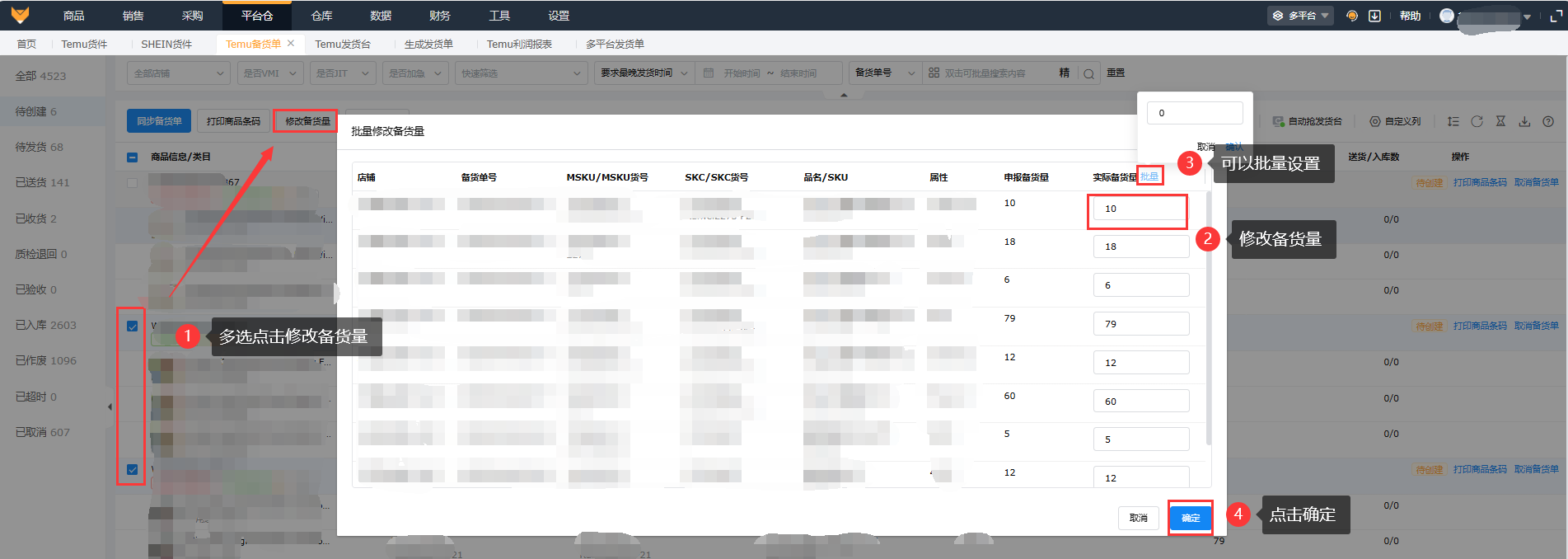 多选备货单,点击列表操作中的“修改备货量”