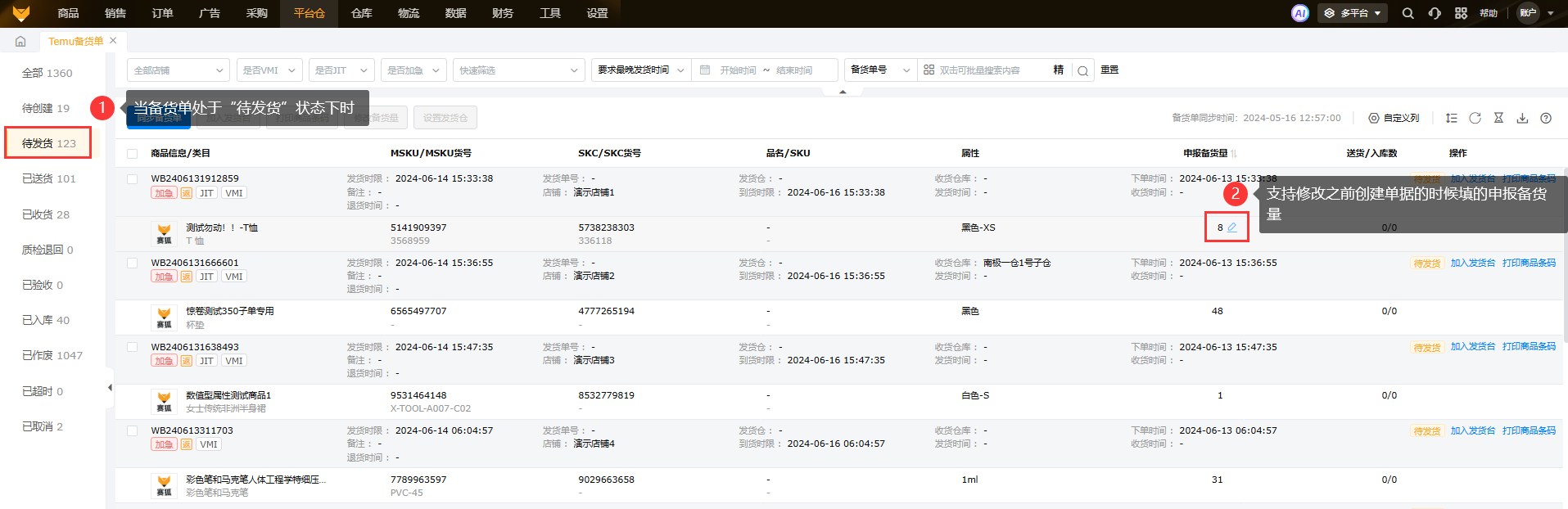 集中查看、管理多个店铺的备货单,支持批量加入发货台,提高工作效率;可以直接通过Temu库存模块提交申请备货单,帮助卖家及时处理备货,防止超时。二、数据更新时效