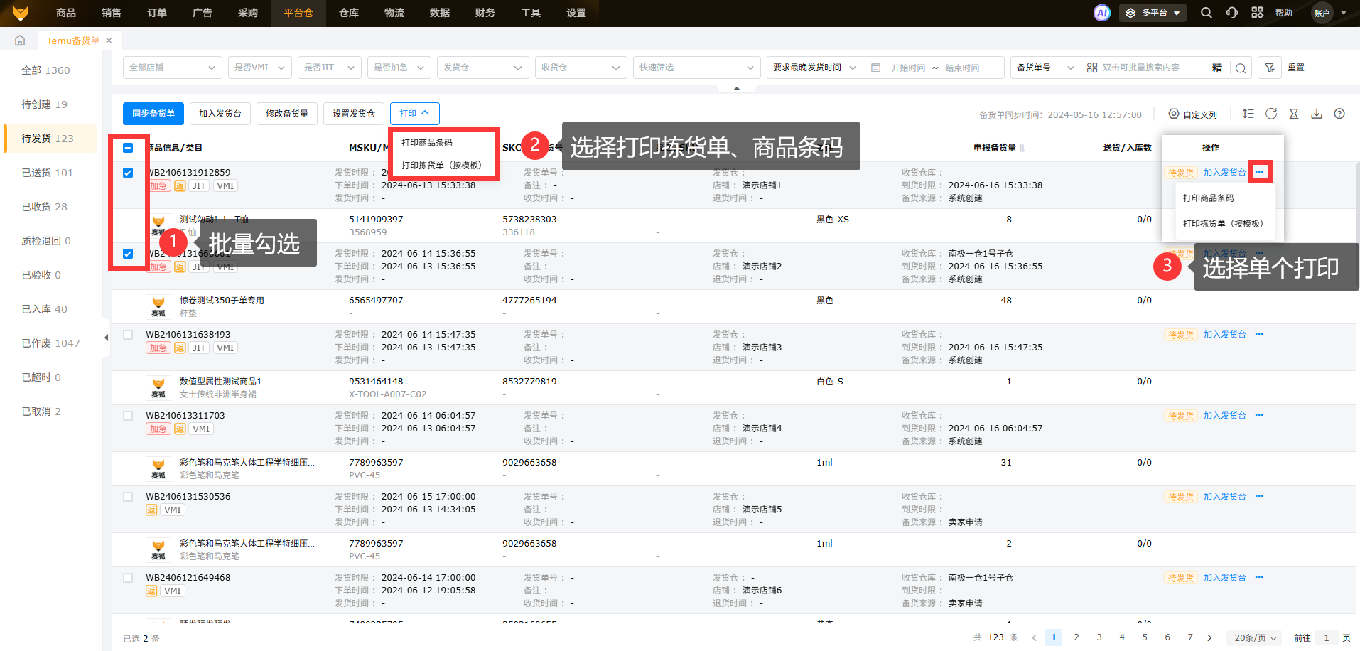 支持批量勾选备货单进行打印商品条码、拣货单,也支持单个备货单打印商品条码、拣货单。
