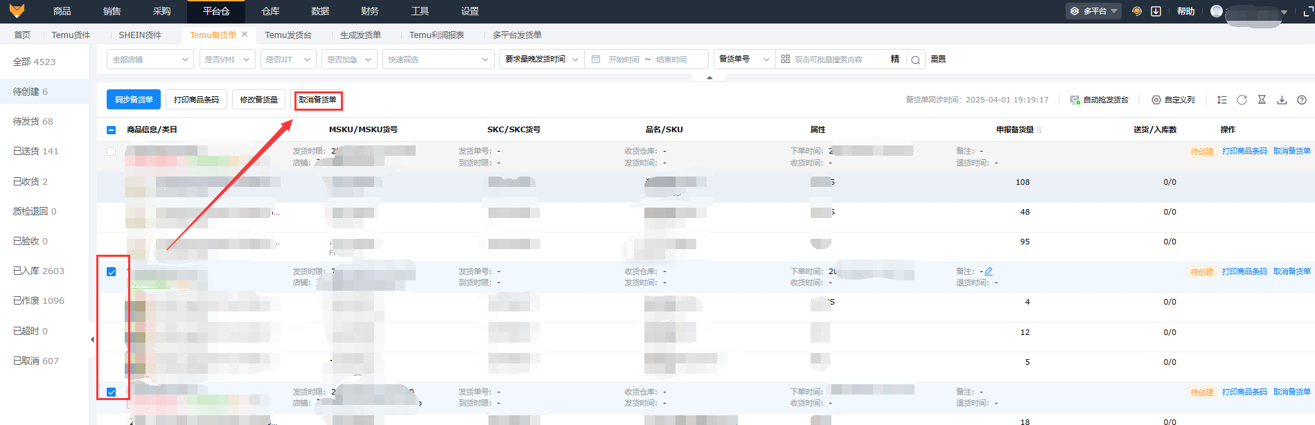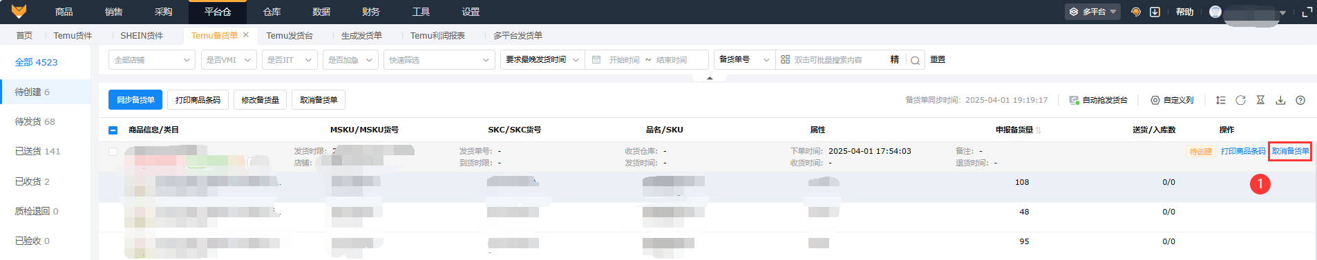 在【待创建】状态下,支持取消普通备货单,可以单个备货单操作取消,也可以批量取消备货单