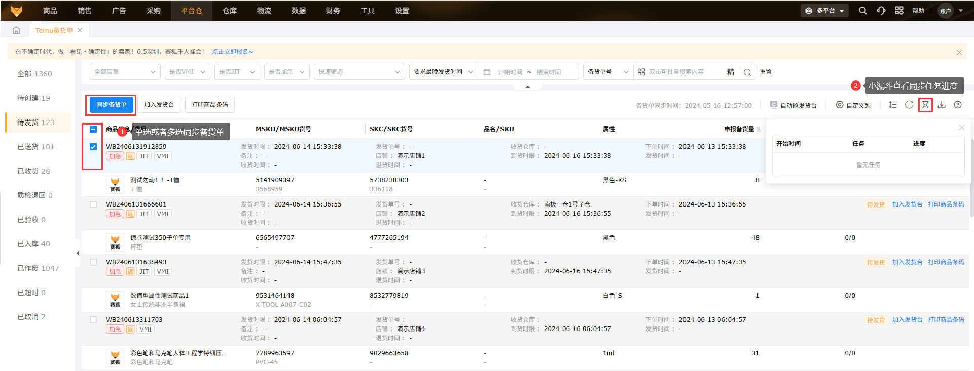 待发货状态的备货单支持多选备货单加入发货台(跨店铺的备货单也支持),也支持单个备货单加入发货台。