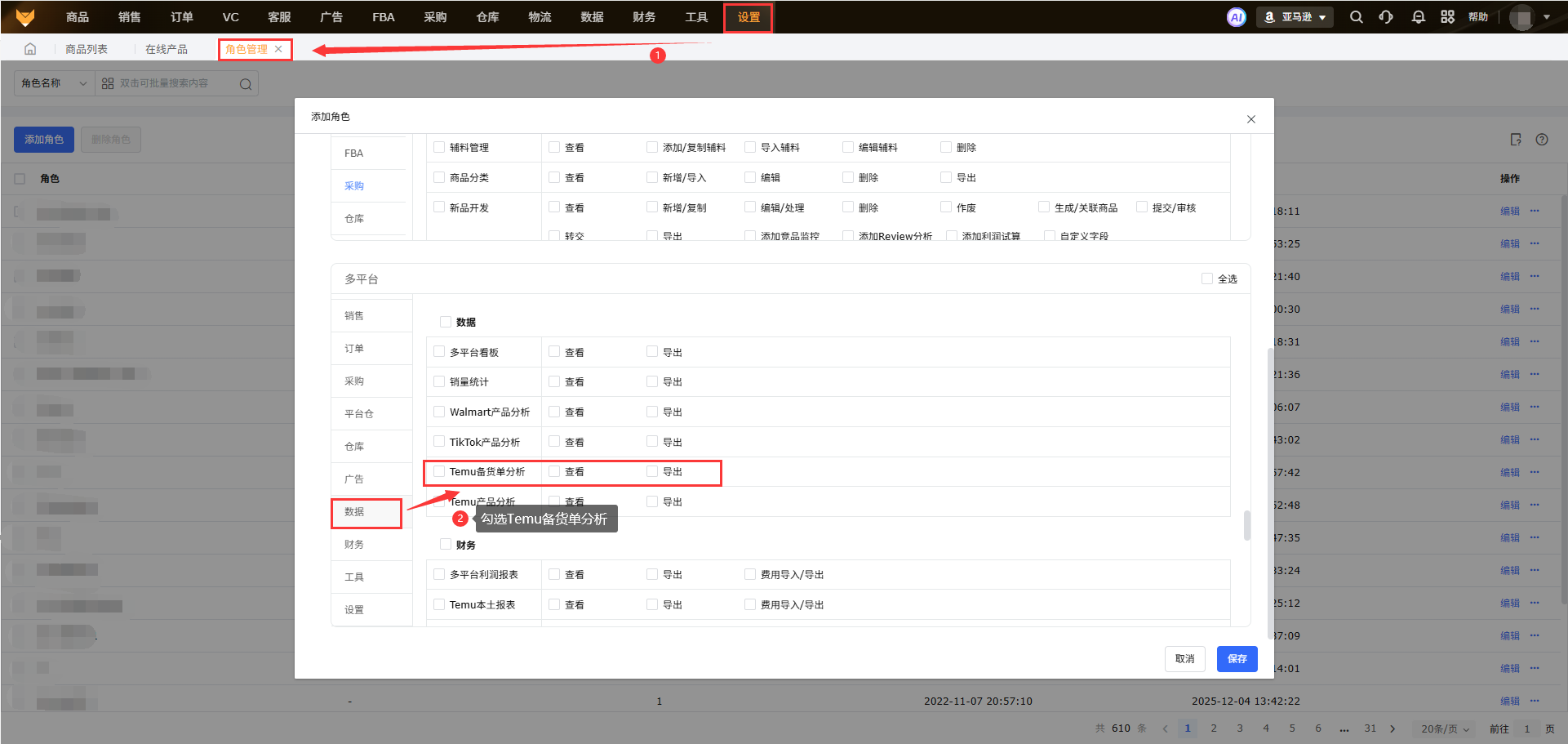 【设置】-【角色管理】页面多平台页面勾选Temu备货单分析权限。