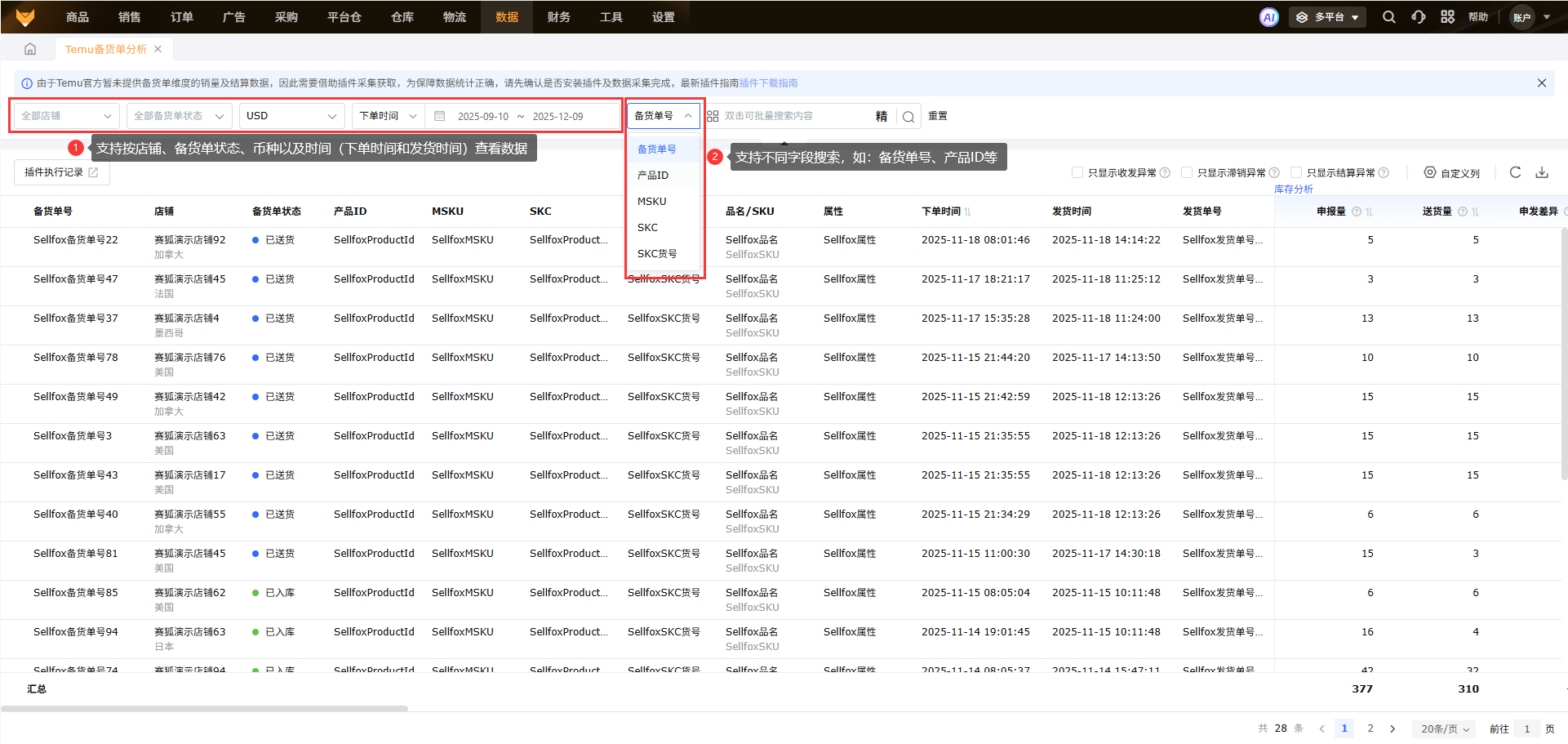 可以按店铺、备货单状态、币种、时间(下单时间和发货时间)以及不同字段搜索。