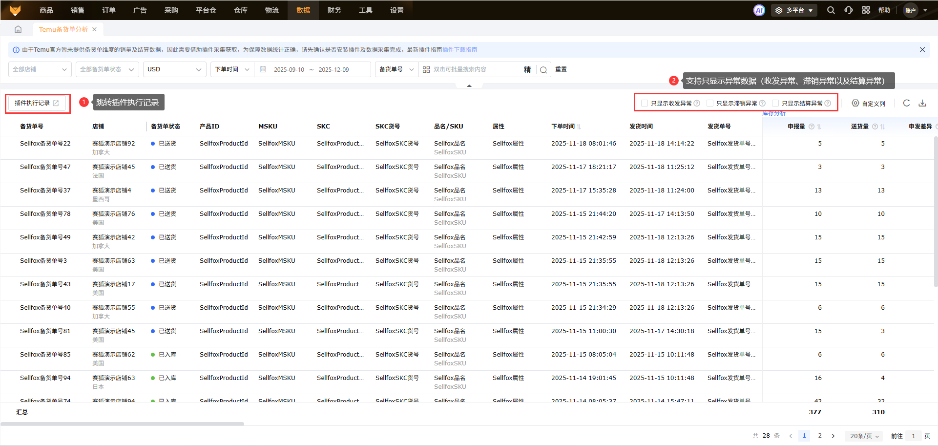 支持调整查看插件执行记录,支持只显示收发异常、只显示滞销异常以及只显示结算异常数据。