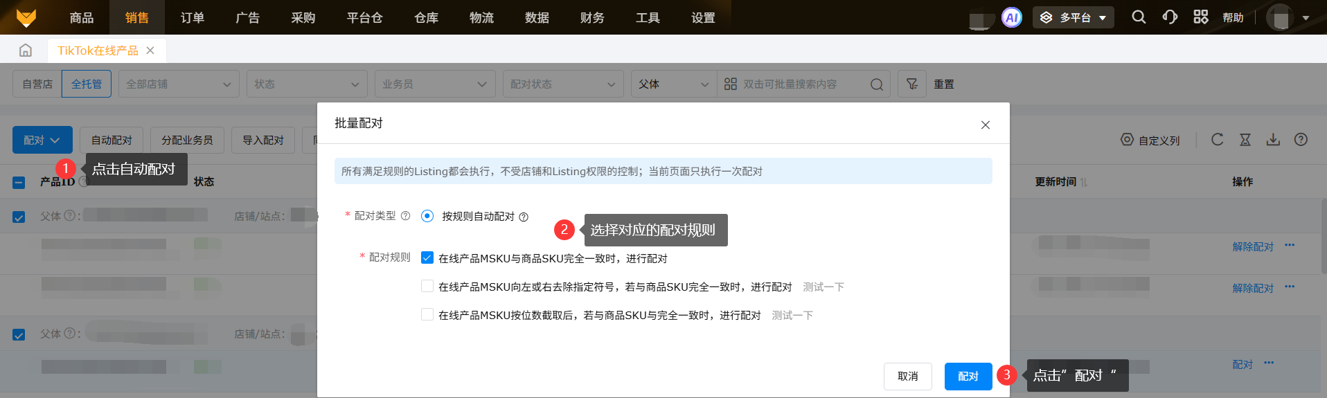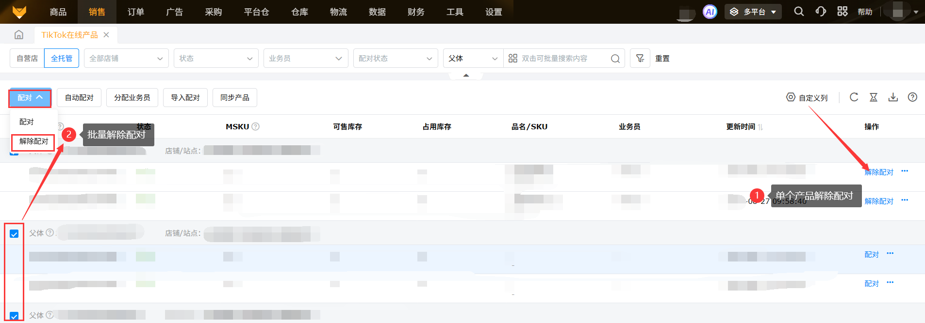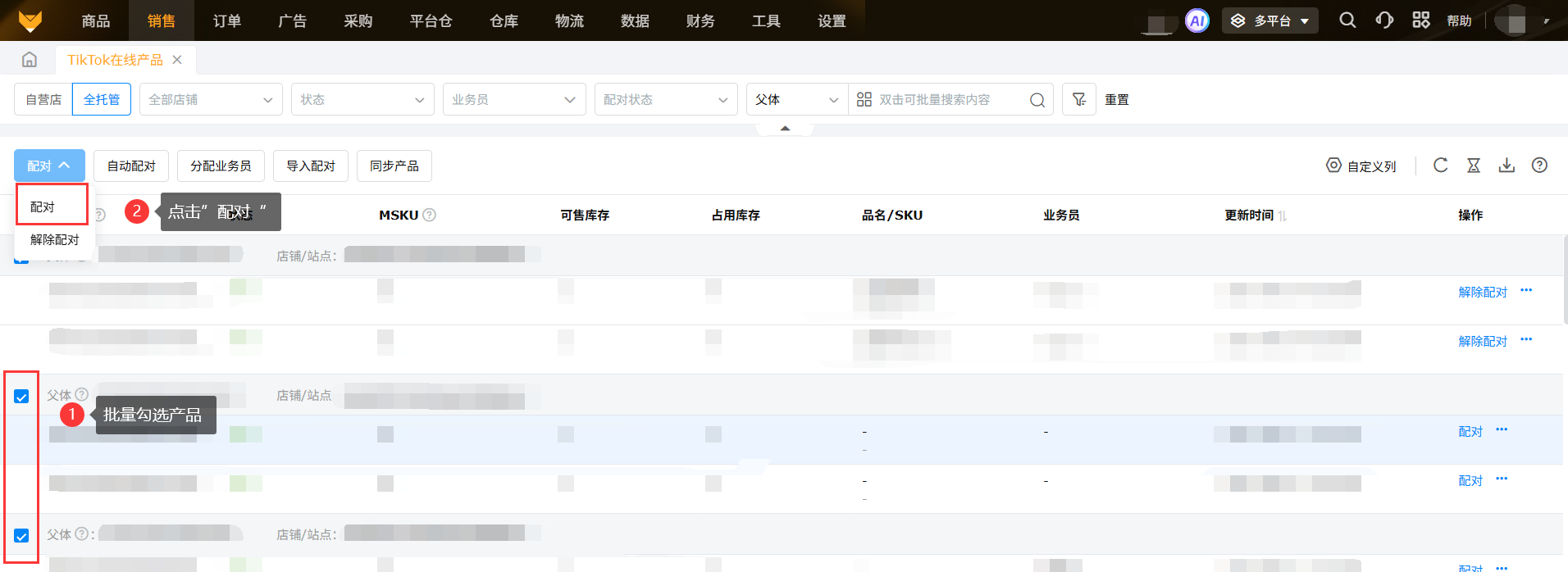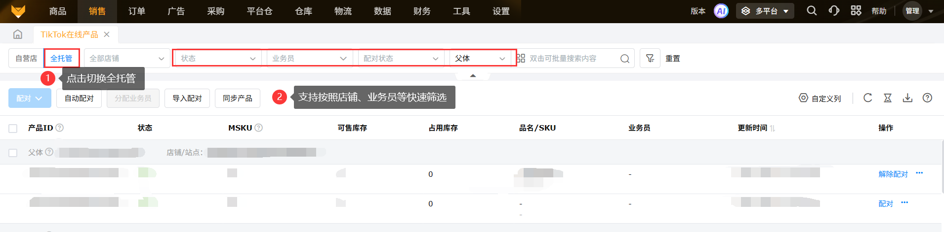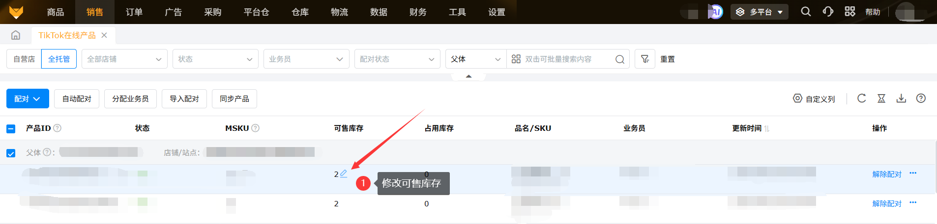 在系统完成授权店铺之后,在线产品页面会显示已授权店铺的产品MSKU、价格、库存、属性等信息。