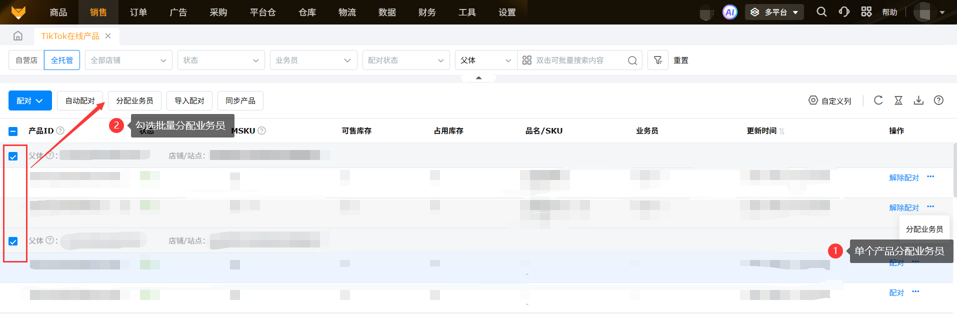 勾选产品,点击【分配业务员】;支持多选业务员,如果选择多个业务员,需选择业绩归属,如不选择则默认归属于第一个人;