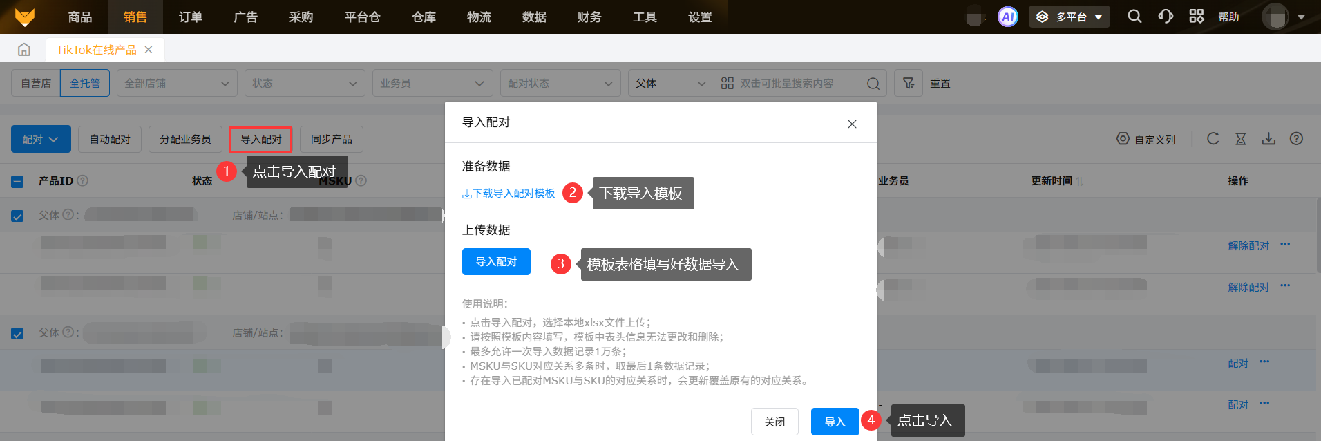 操作:点击【导入数据】选择导入配对,下载导入配对模板,填写模板信息,上传模板文件,点击【导入】即可。