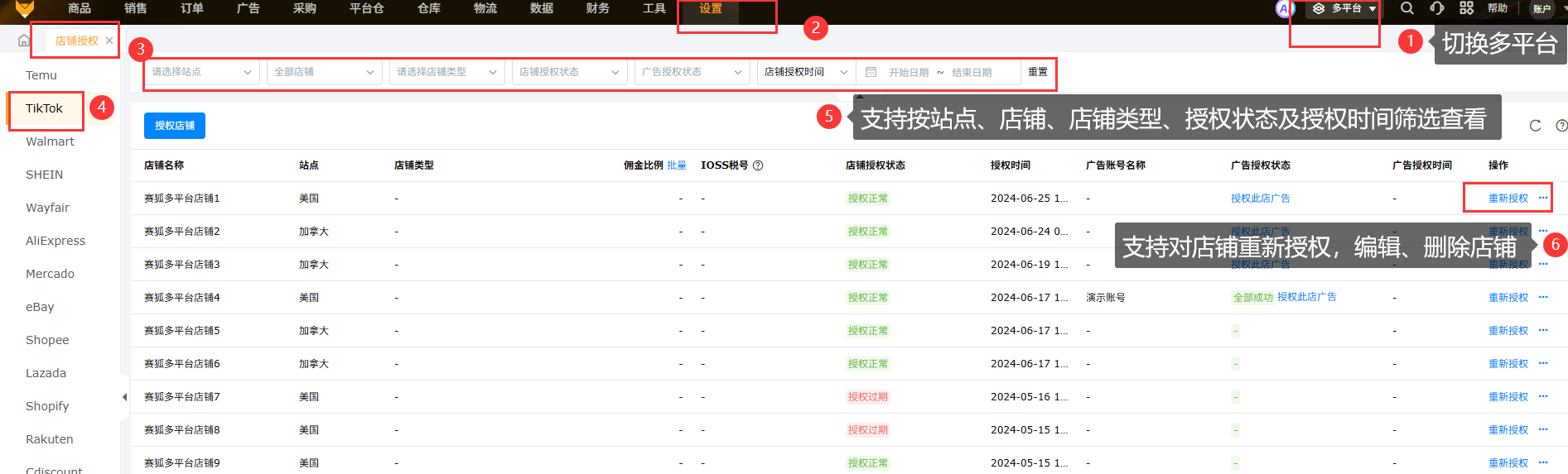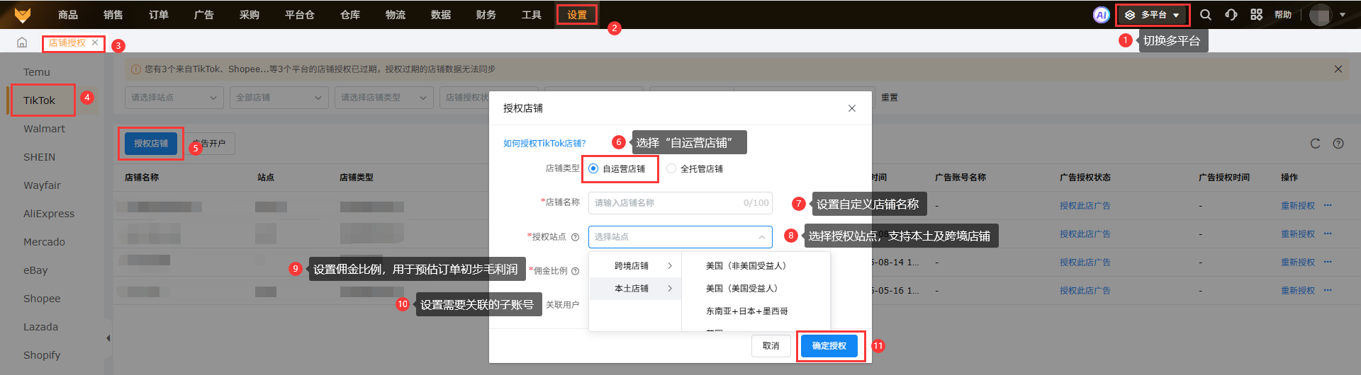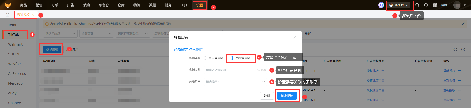 3.1 切换多平台,【设置-店铺授权-TikTok-授权店铺-选择全托管店铺】