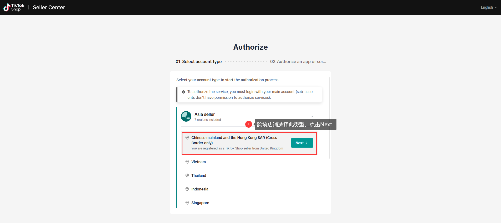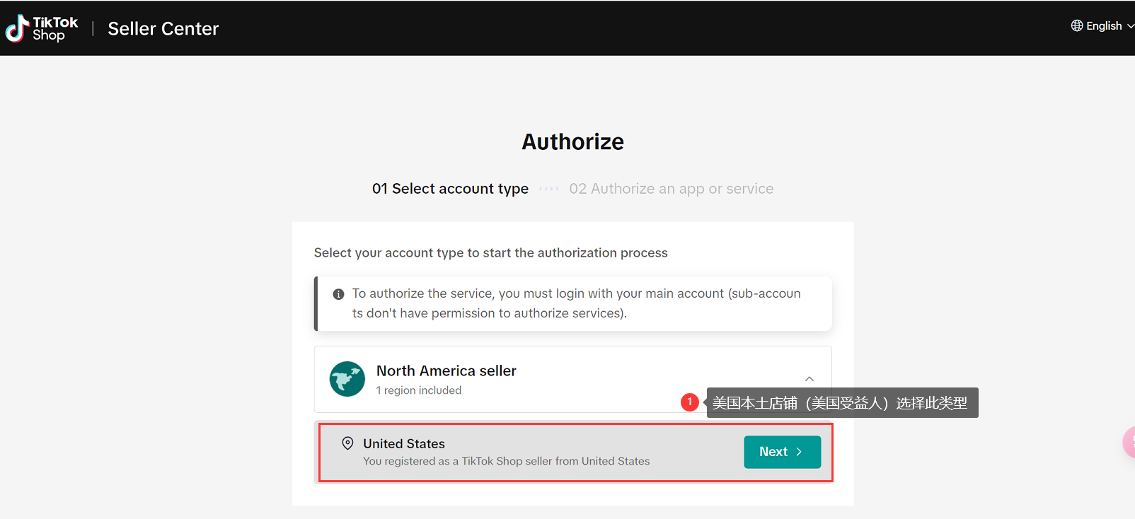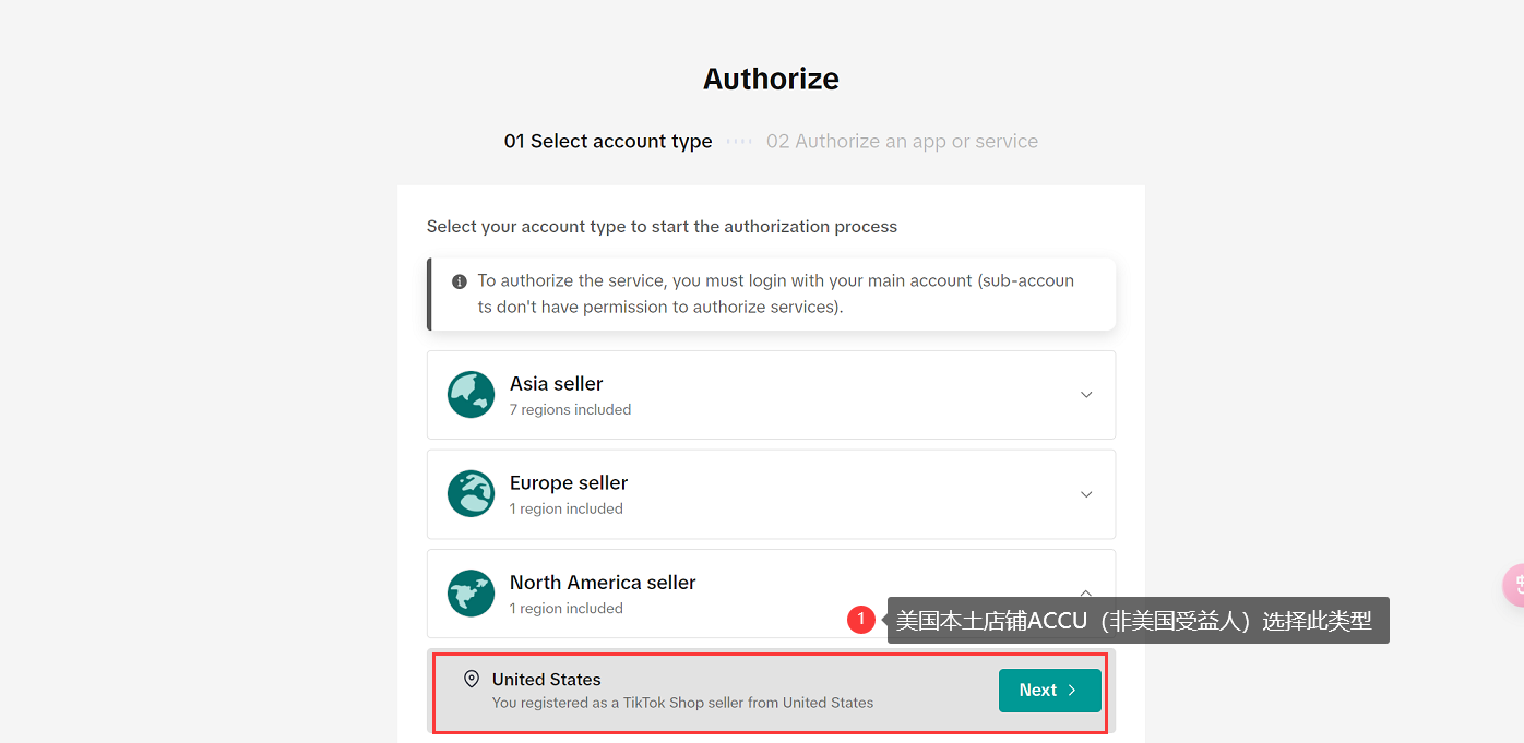 2.2 跳转登陆页面,选择店铺类型,点击Next。