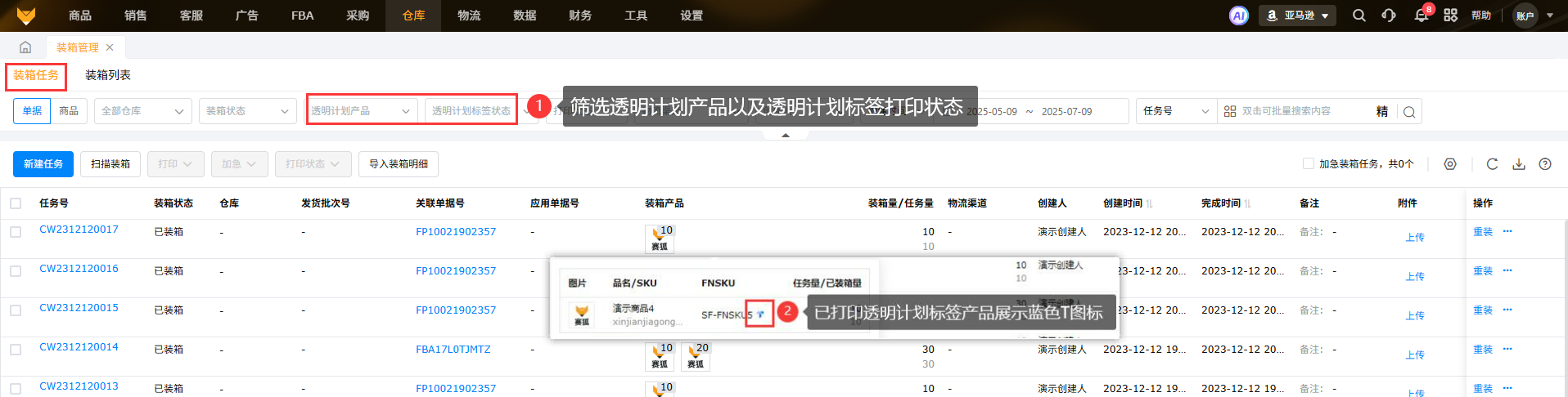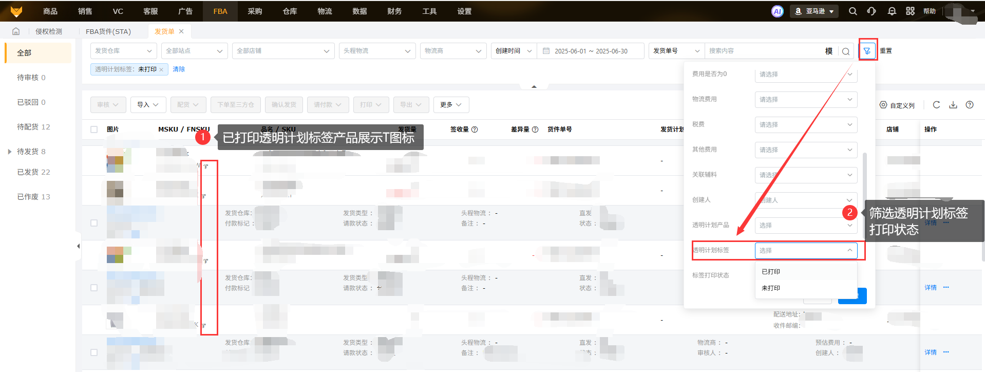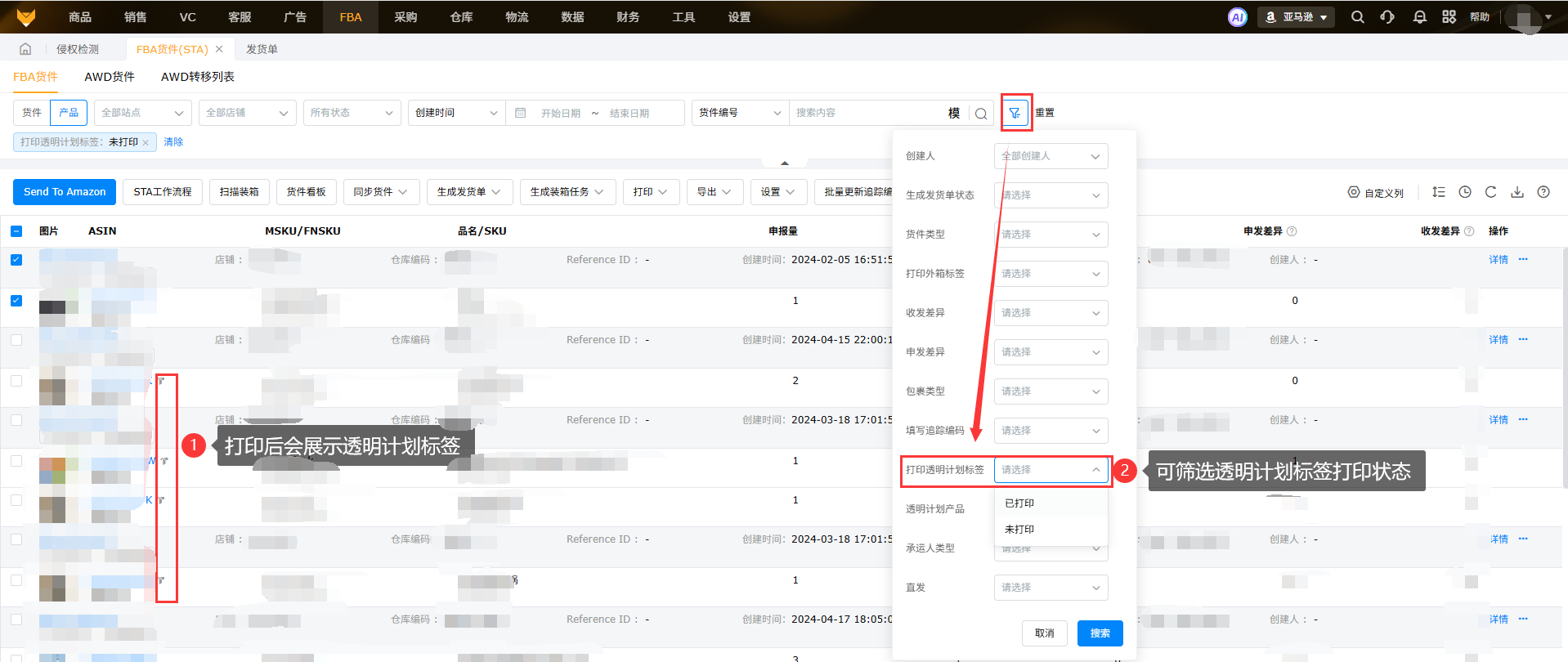 A2:在FBA货件、发货单、发货计划和装箱管理界面都可以筛选透明计划标签的产品,并且可以筛选是否已打印;而在线产品页面只能筛选是否是透明计划产品。