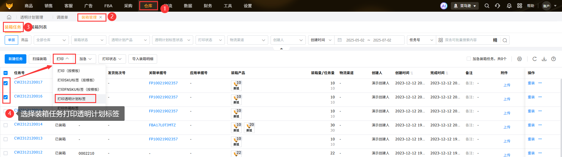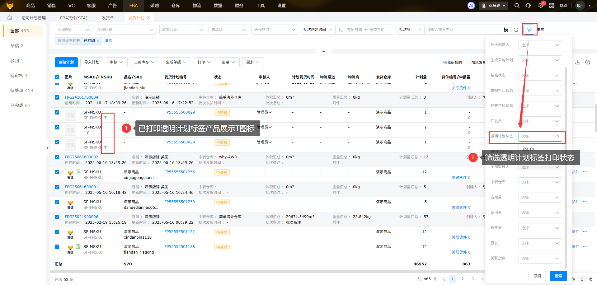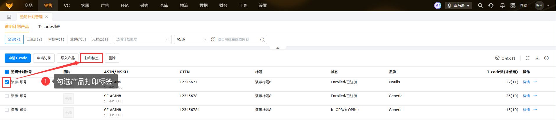 A2:在FBA货件、发货单、发货计划和装箱管理界面都可以筛选透明计划标签的产品,并且可以筛选是否已打印;而在线产品页面只能筛选是否是透明计划产品。