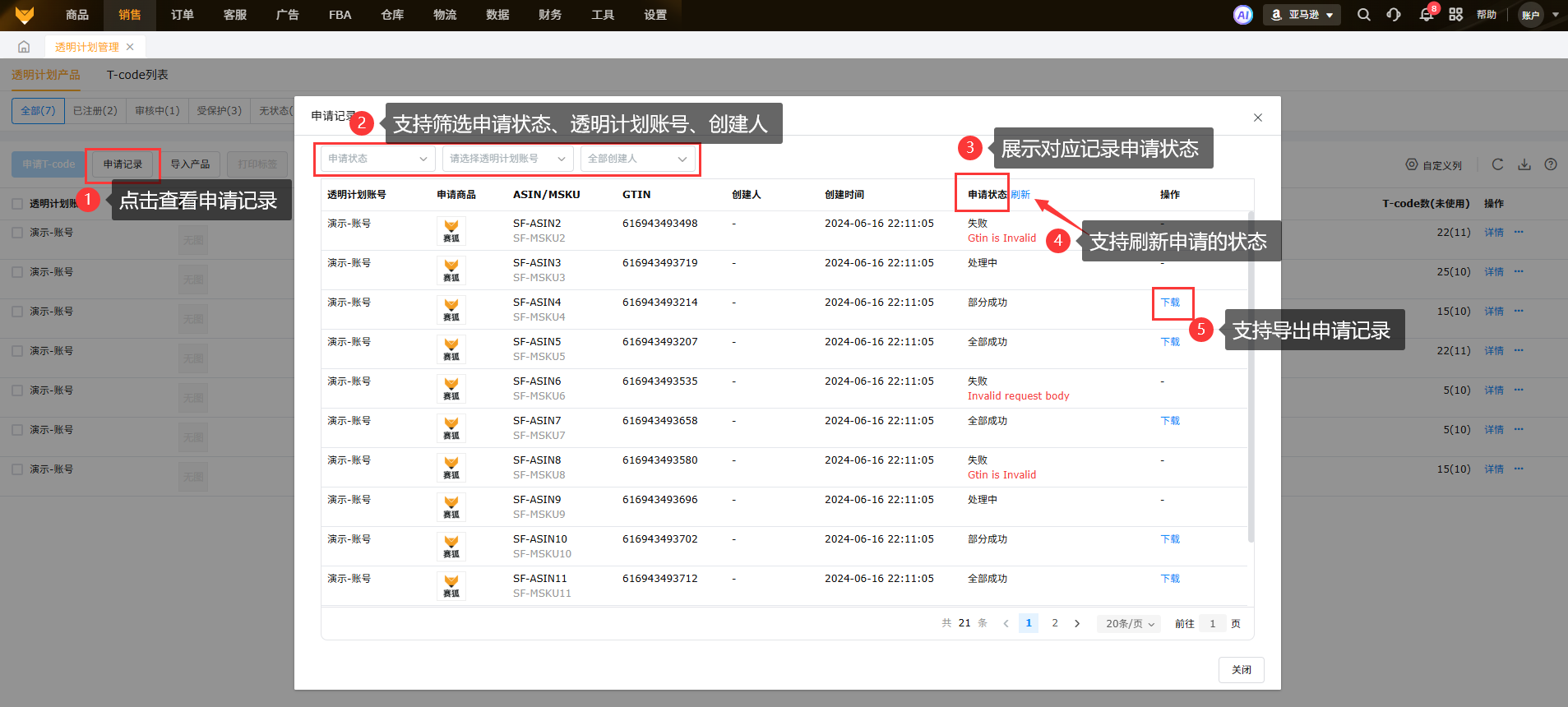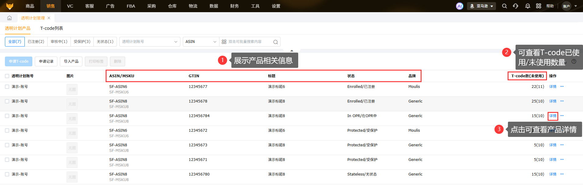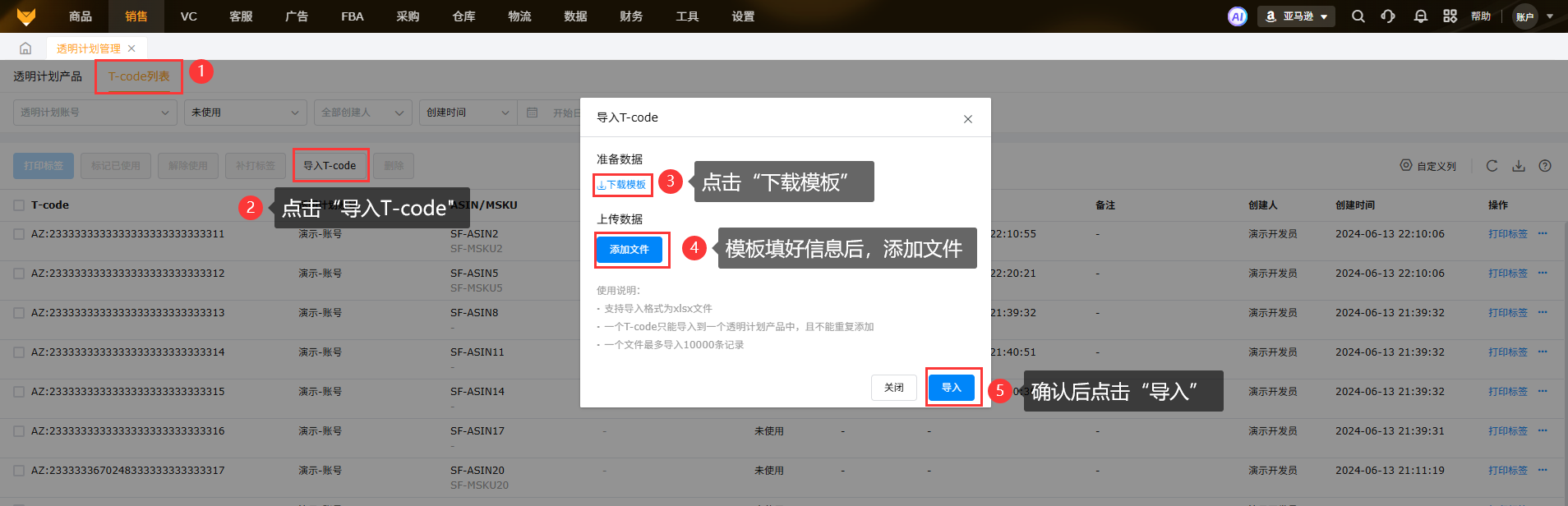 支持导入亚马逊获取T-code编码到系统使用,在系统申请的T-code编码也会展示在此。