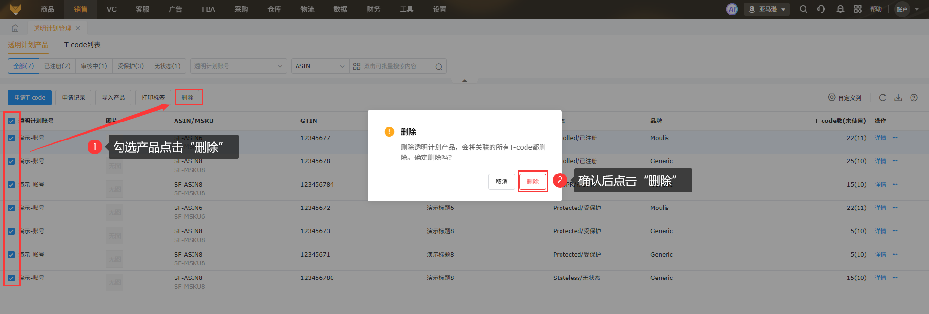 支持删除透明计划产品,操作后会将关联的所有T-code都删除。