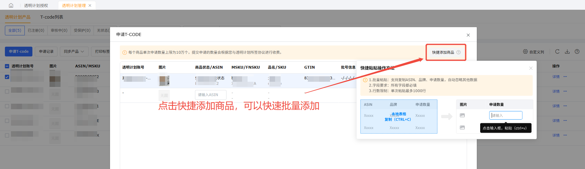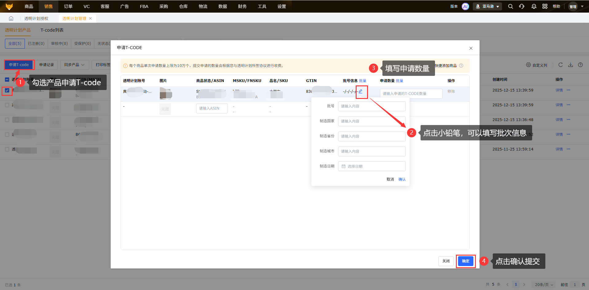 已添加的透明计划产品支持申请T-code编码,支持在申请T-code时设置批号。