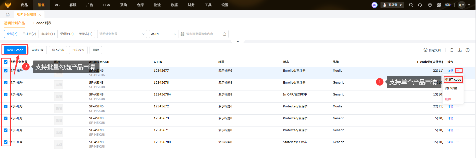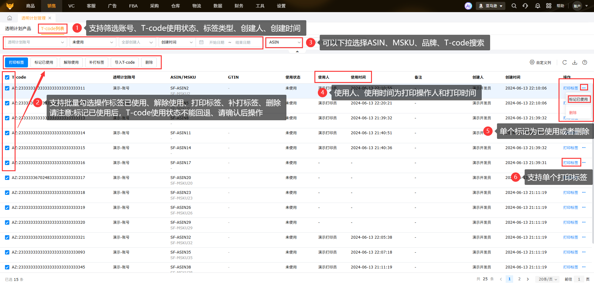 支持筛选店铺、创建人、创建时间,可按账号名称、备注搜索。可以单个操作或者批量操作申请T-code、打印标签、删除。
