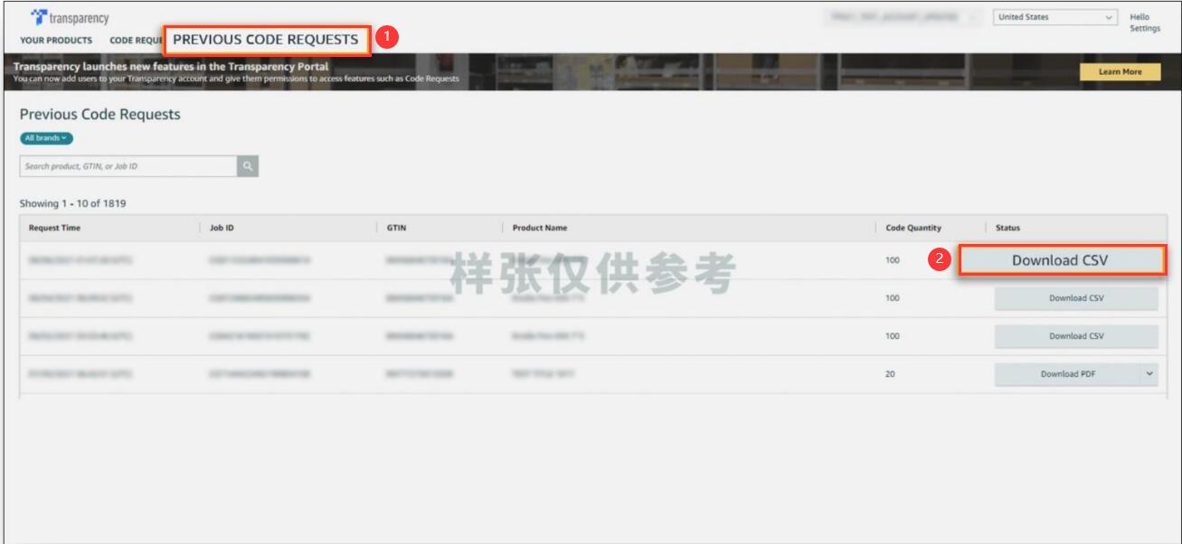 (1)登录 Transparency 自助服务平台,点击 Code Requests (代码请求),请点击页面左上角“Previous Code Requests (之前的代码请求)”查询历史申请记录,根据您刚刚申请代码的时间以及数量点击“Download CSV(下载 CSV 文件)”。