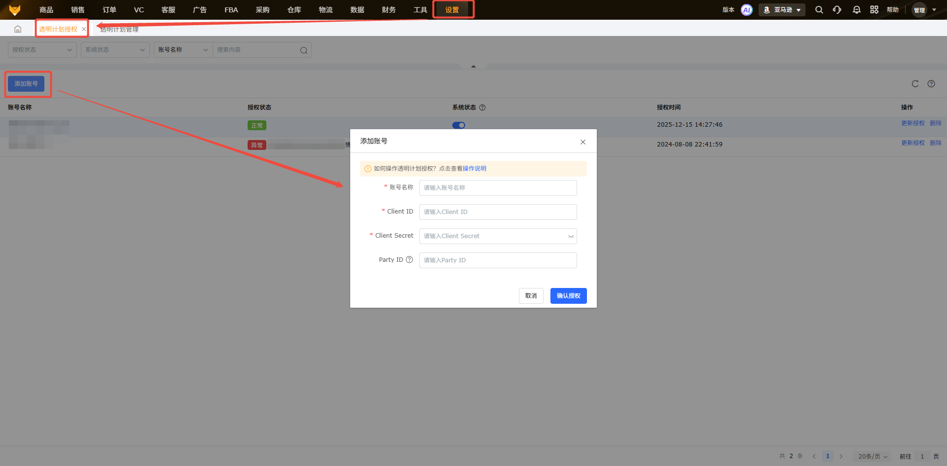 在【设置】-【透明计划授权】页面添加账号,详情操作可查看透明计划授权。