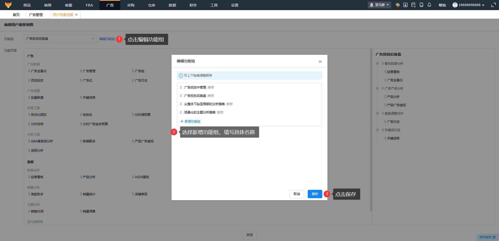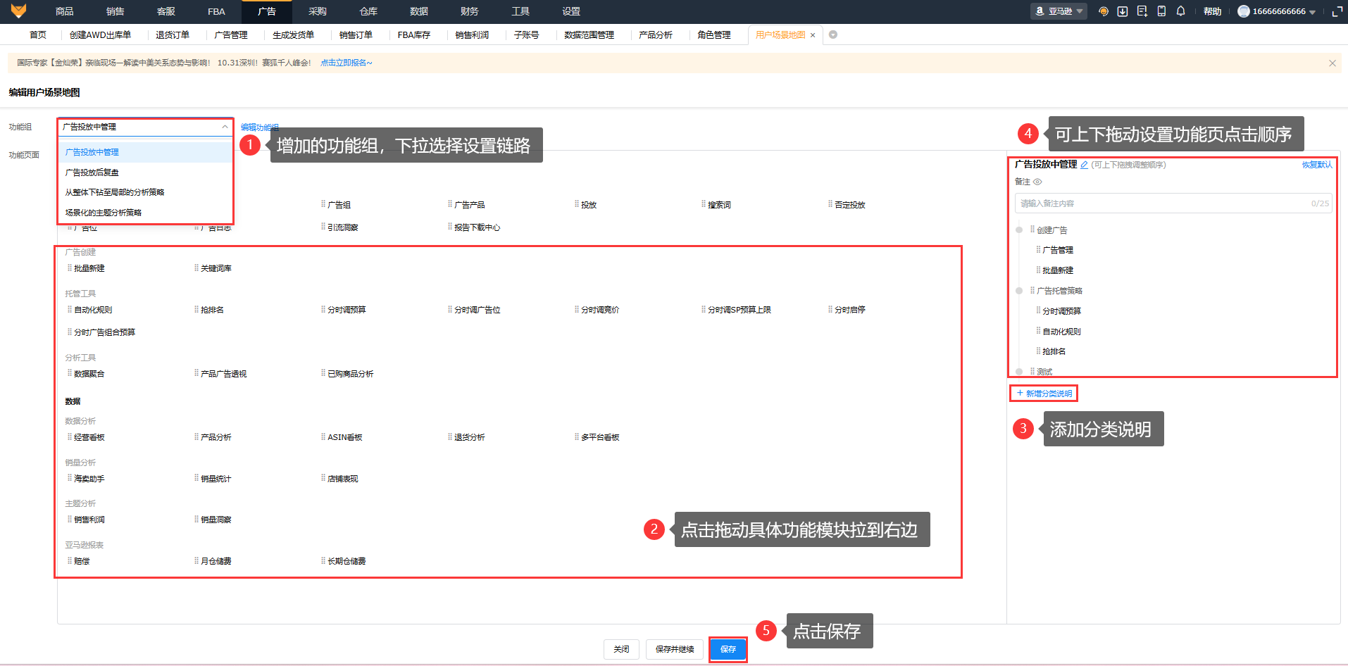 1.4、下拉功能组选项,找到刚才新增的场景地图名称,在功能页面中找到这个场景下需要使用到的功能页,拖动到右边的场景地图分析链路中;右侧的分析链路需要先增加分类说明;如:我们在广告投放这边场景下,会有创建广告--广告托管策略--投放效果查看,几个大的分类;需要先创建分类,然后在分类下添加具体功能页面,在分析链路中可以上下拖动,调整在这个场景下功能页面跳转顺序,最后点击保存场景地图。