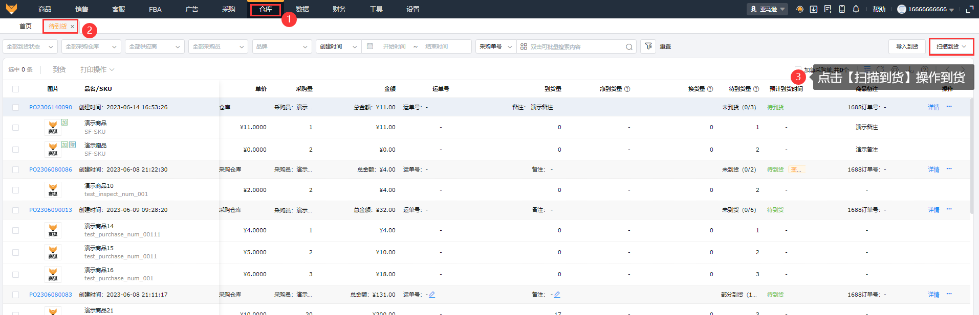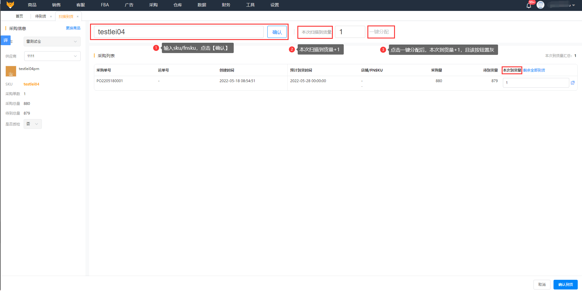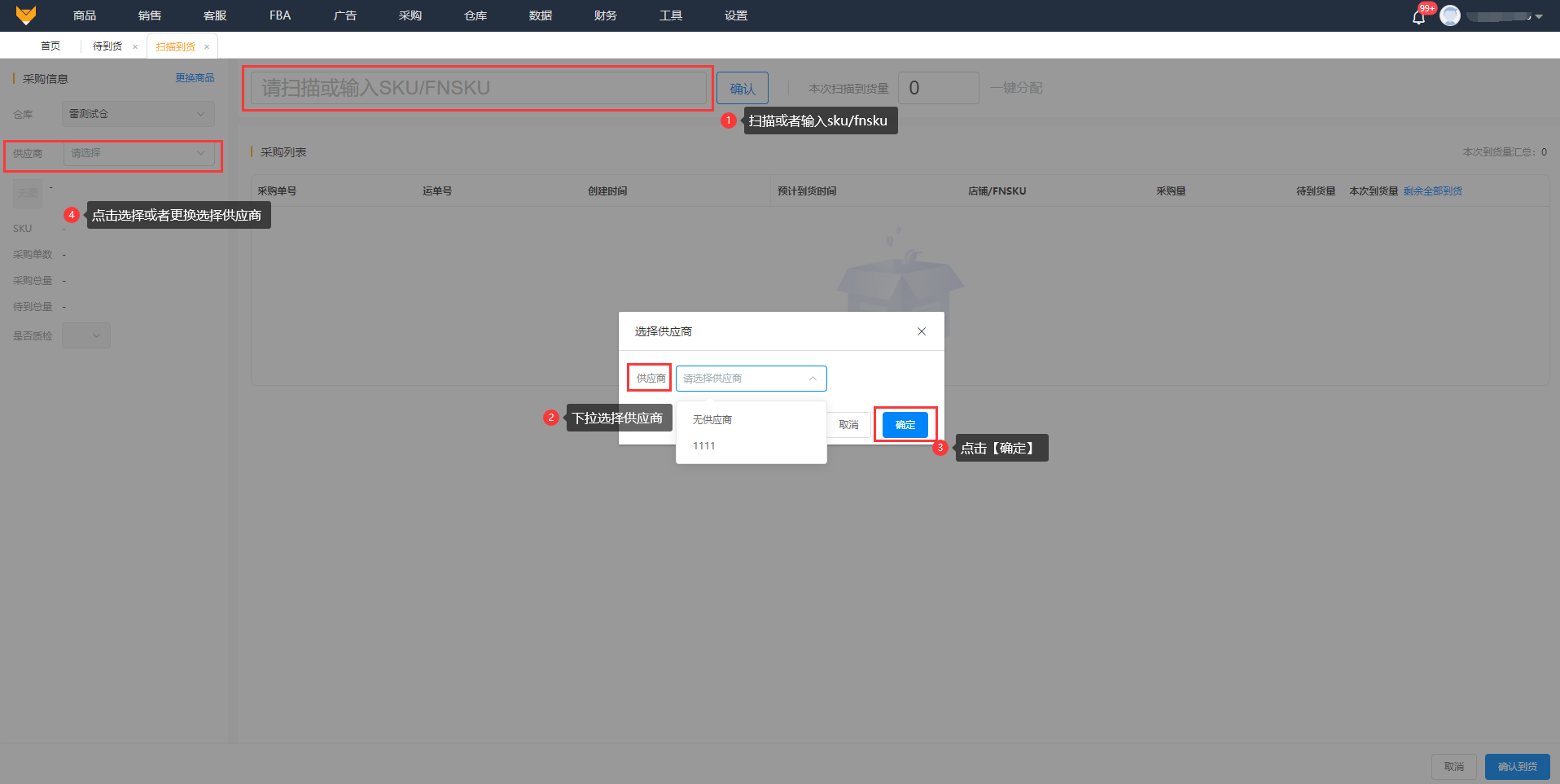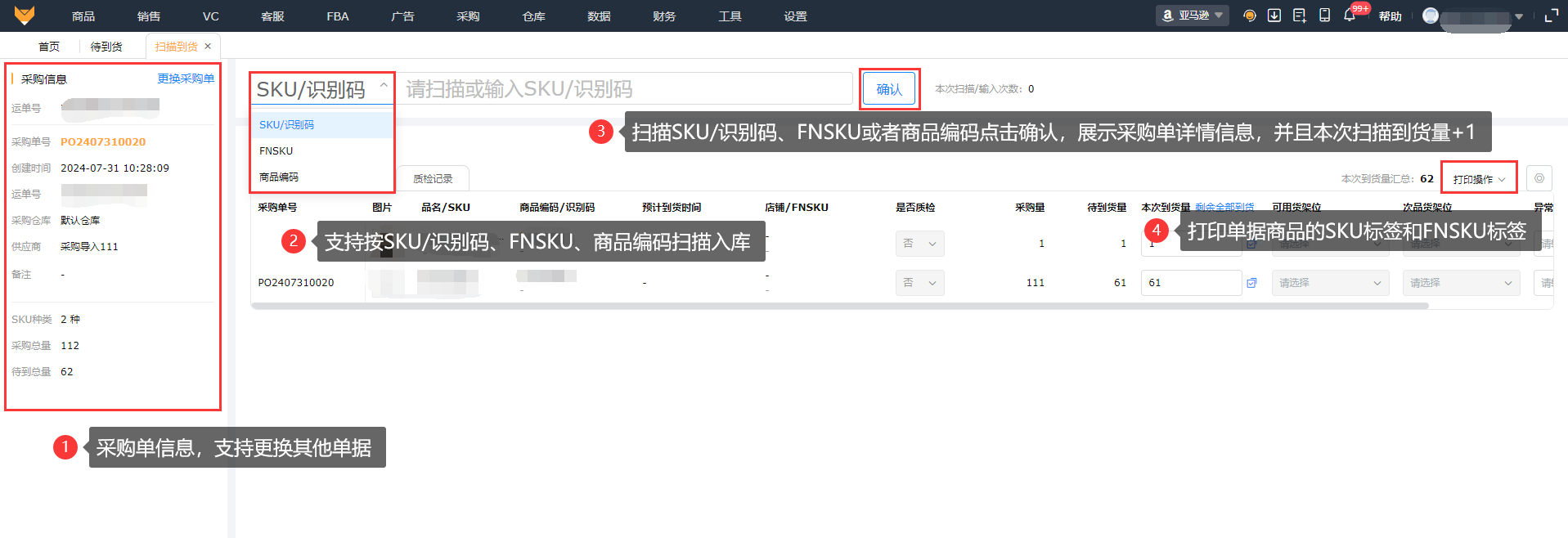 在【仓库】>【待到货】点击“扫描到货”,支持扫描/输入采购单号/运单号方式和扫描具体产品条码(SKU、FNSKU)到货操作。