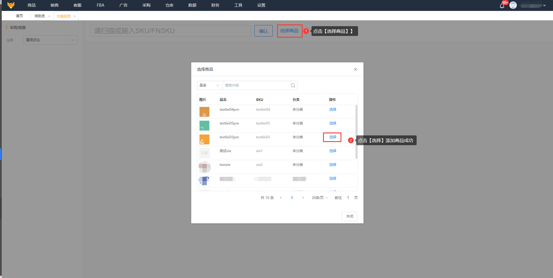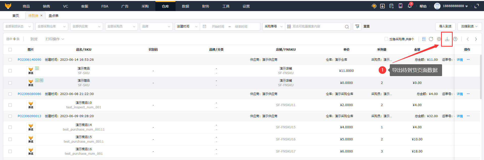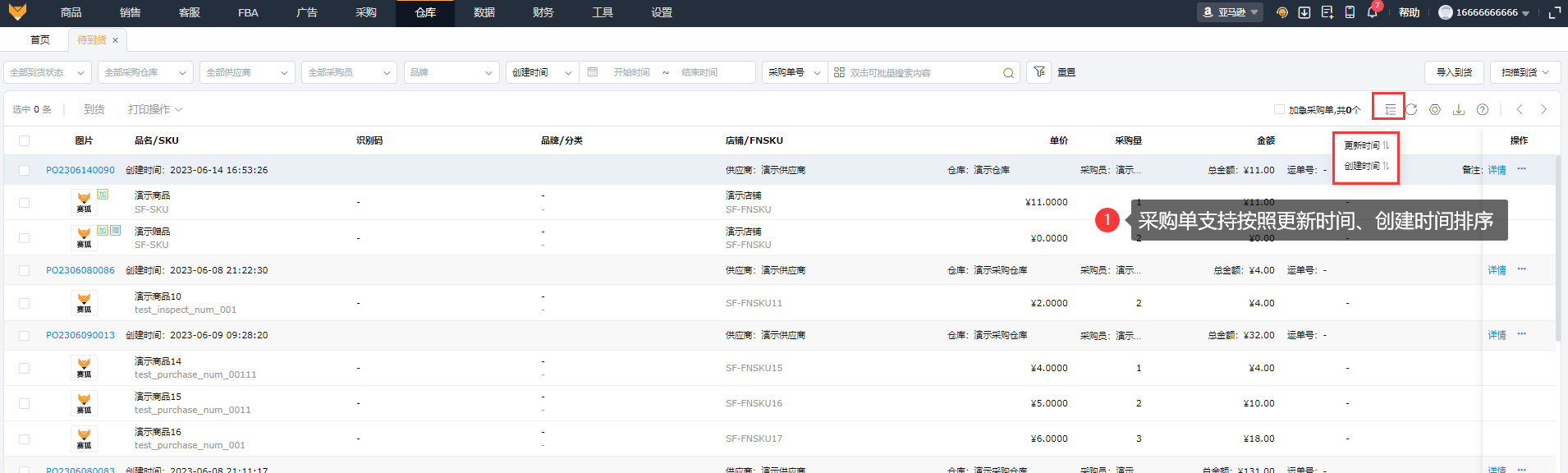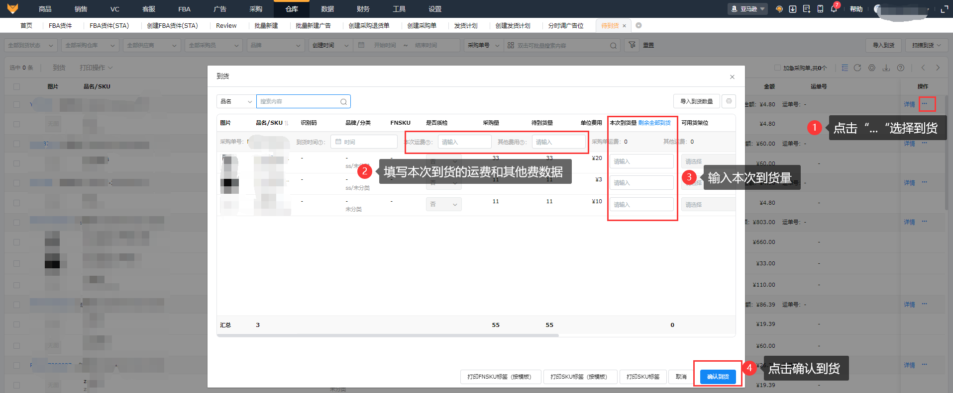 在【仓库】>【待到货】点击“扫描到货”,支持扫描/输入采购单号/运单号方式和扫描具体产品条码(SKU、FNSKU)到货操作。